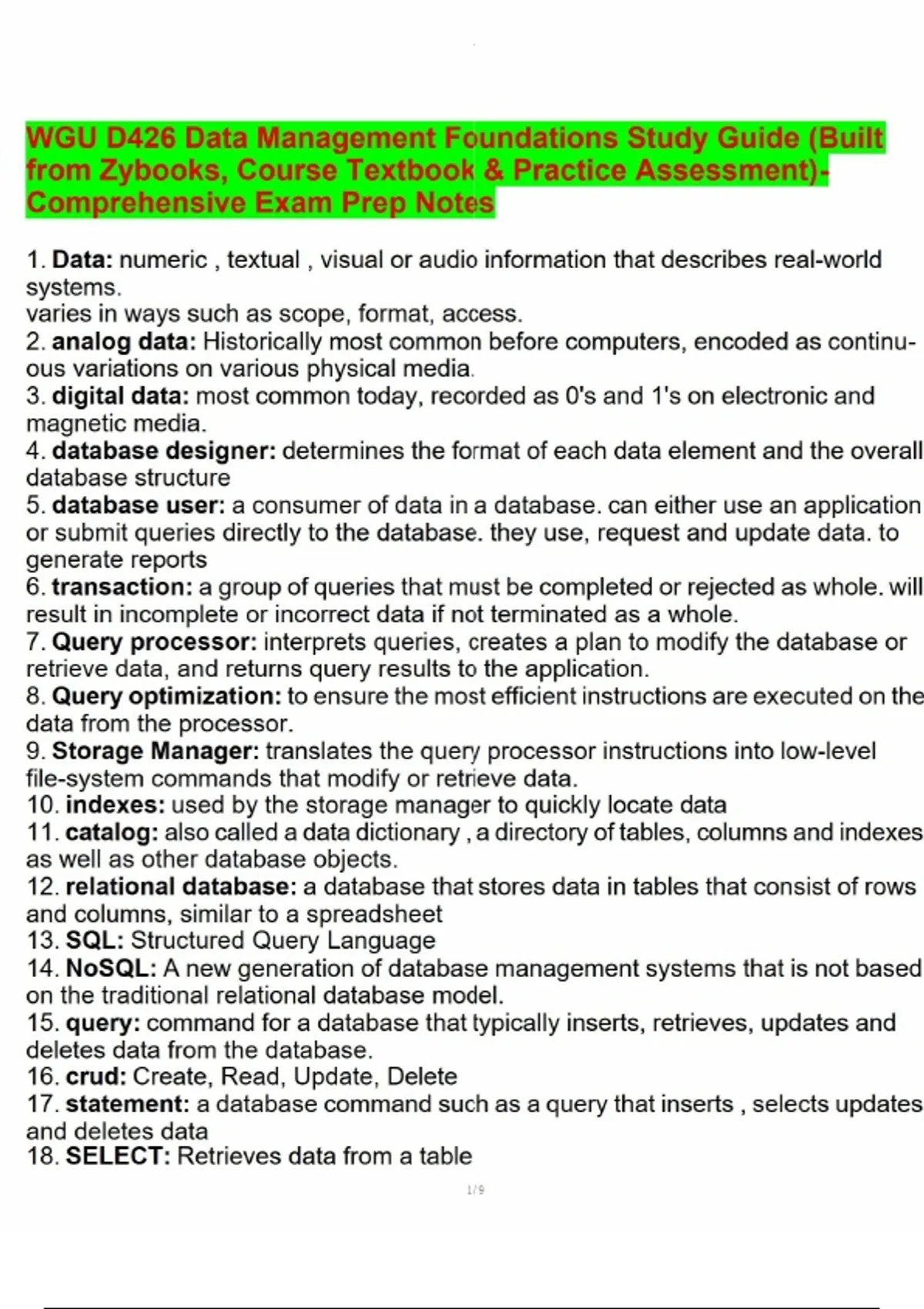 WGU D426 Data Management Foundations Study Guide (Built from Zybooks, Course Textbook & Practice Assessment)-Comprehensive Exam Prep Notes.pdf
