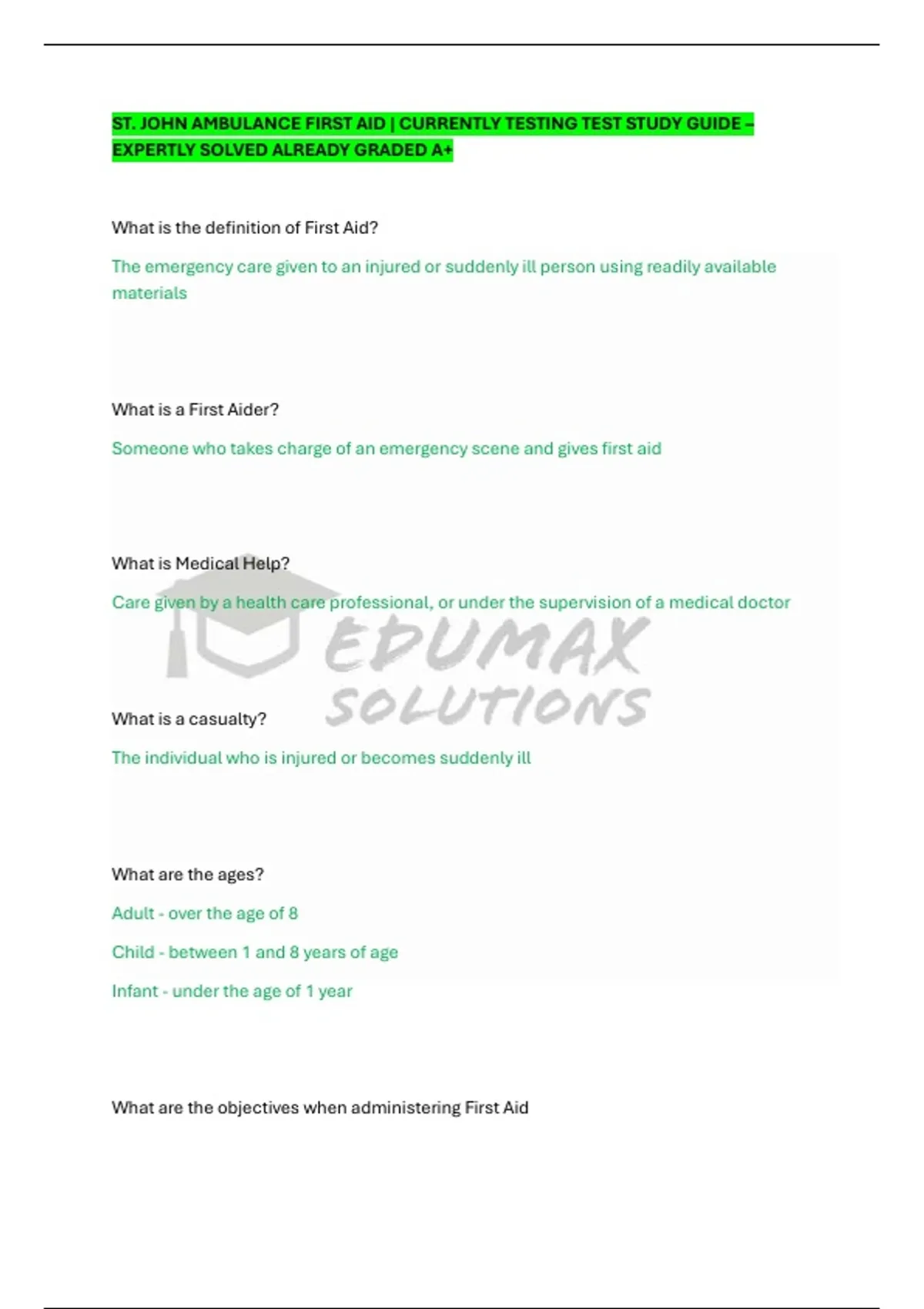 ST. JOHN AMBULANCE FIRST AID | CURRENTLY TESTING TEST STUDY GUIDE – EXPERTLY SOLVED ALREADY GRADED A+