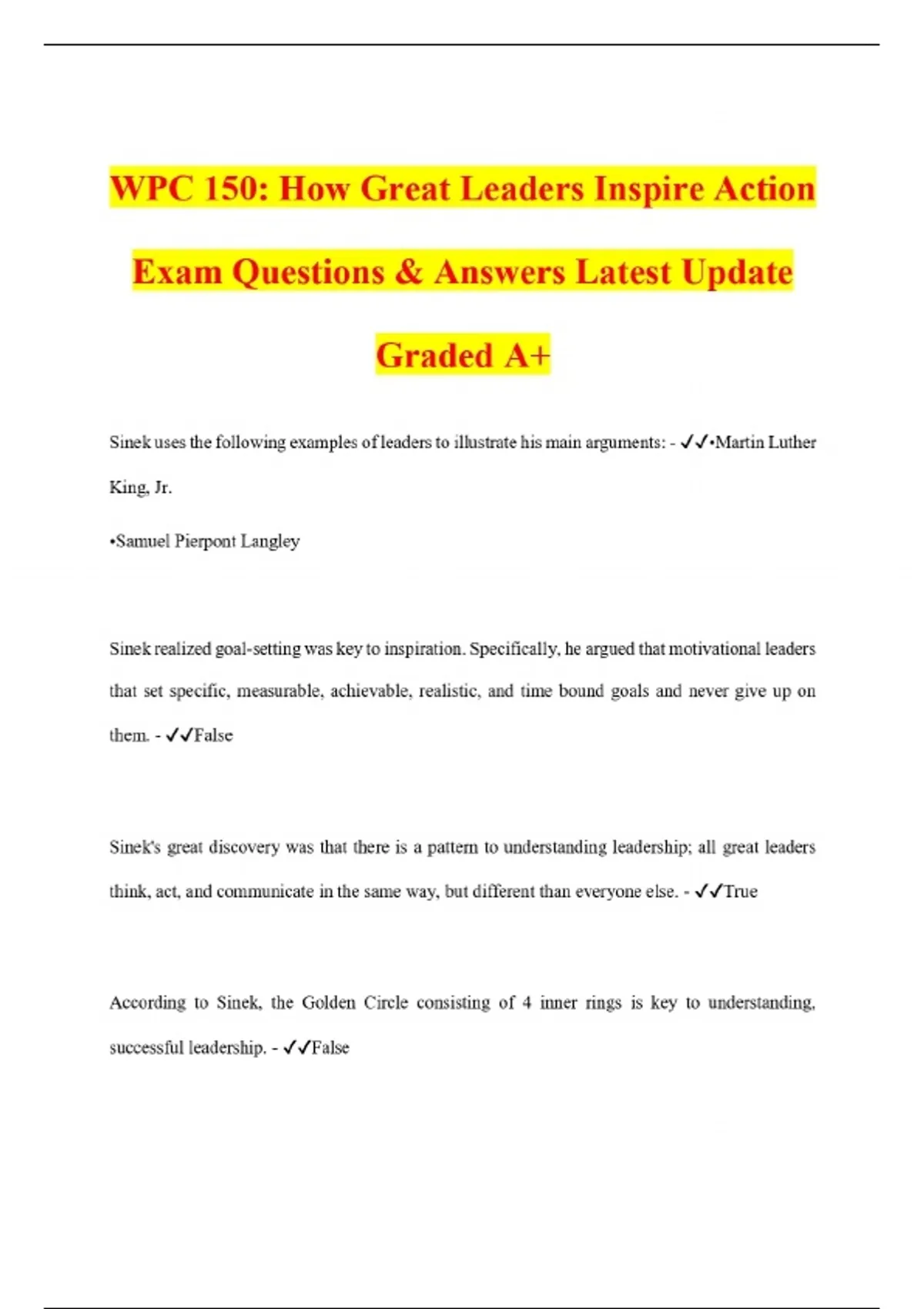 WPC 150: How Great Leaders Inspire Action Exam Questions & Answers Latest Update Graded A+