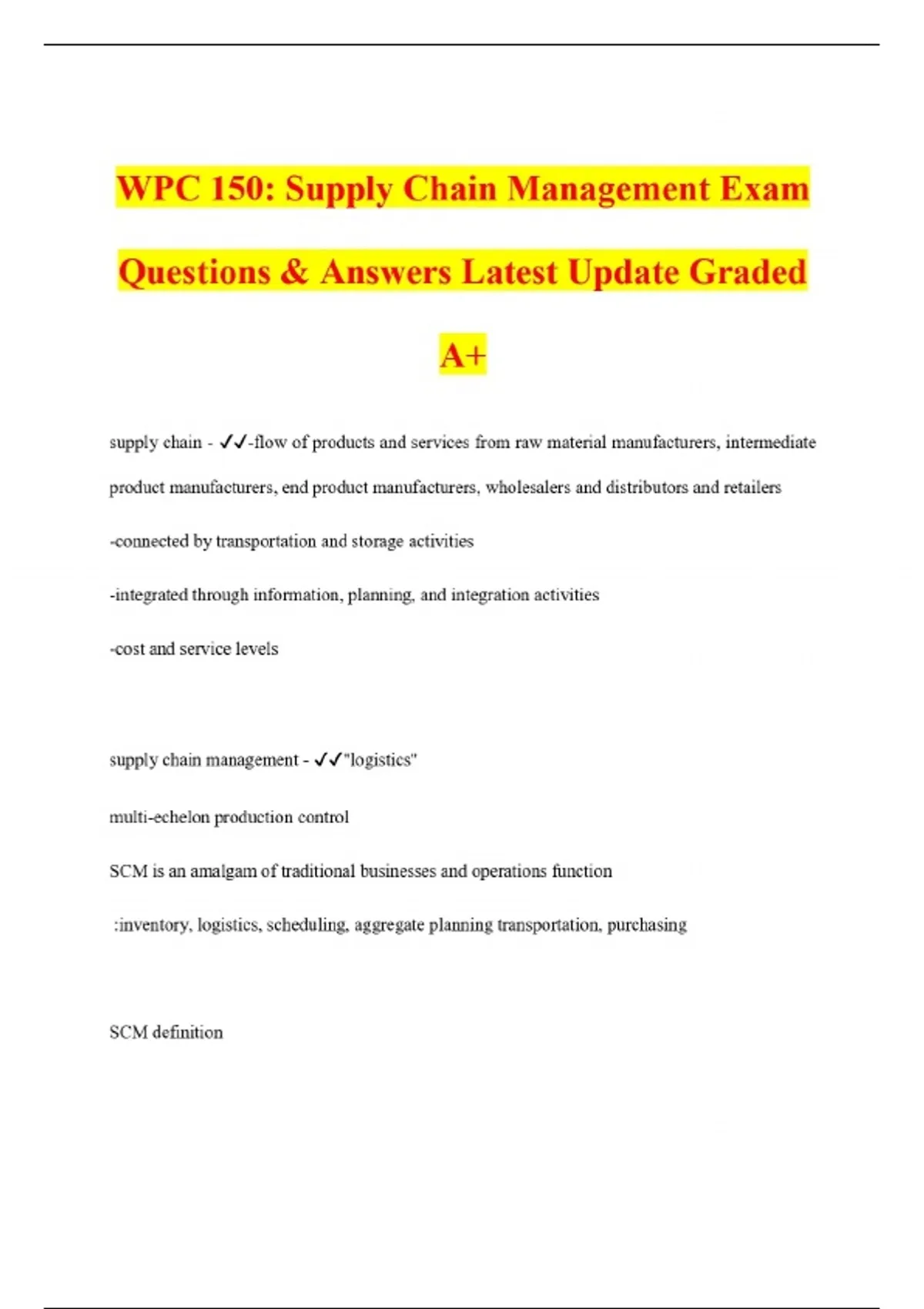 WPC 150: Supply Chain Management Exam Questions & Answers Latest Update Graded A+