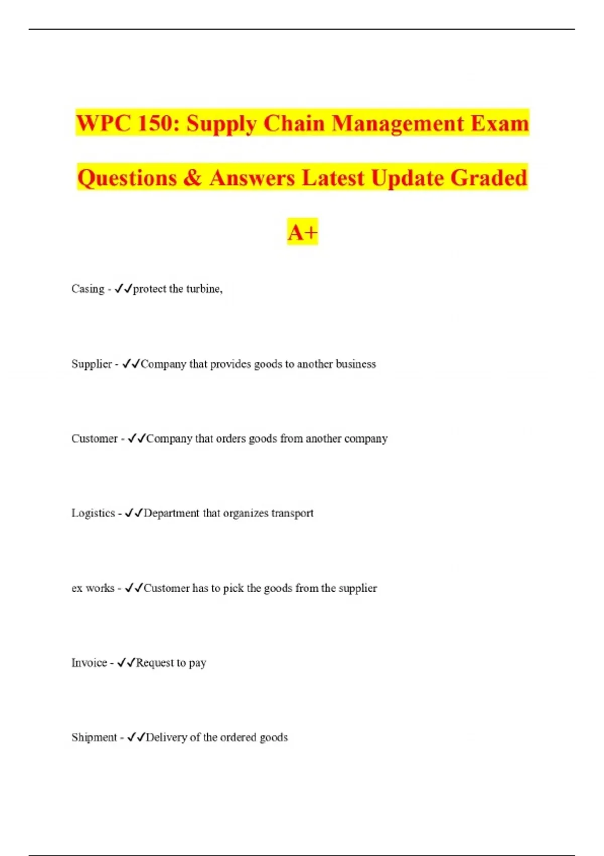 WPC 150: Supply Chain Management Exam Questions & Answers Latest Update Graded A+