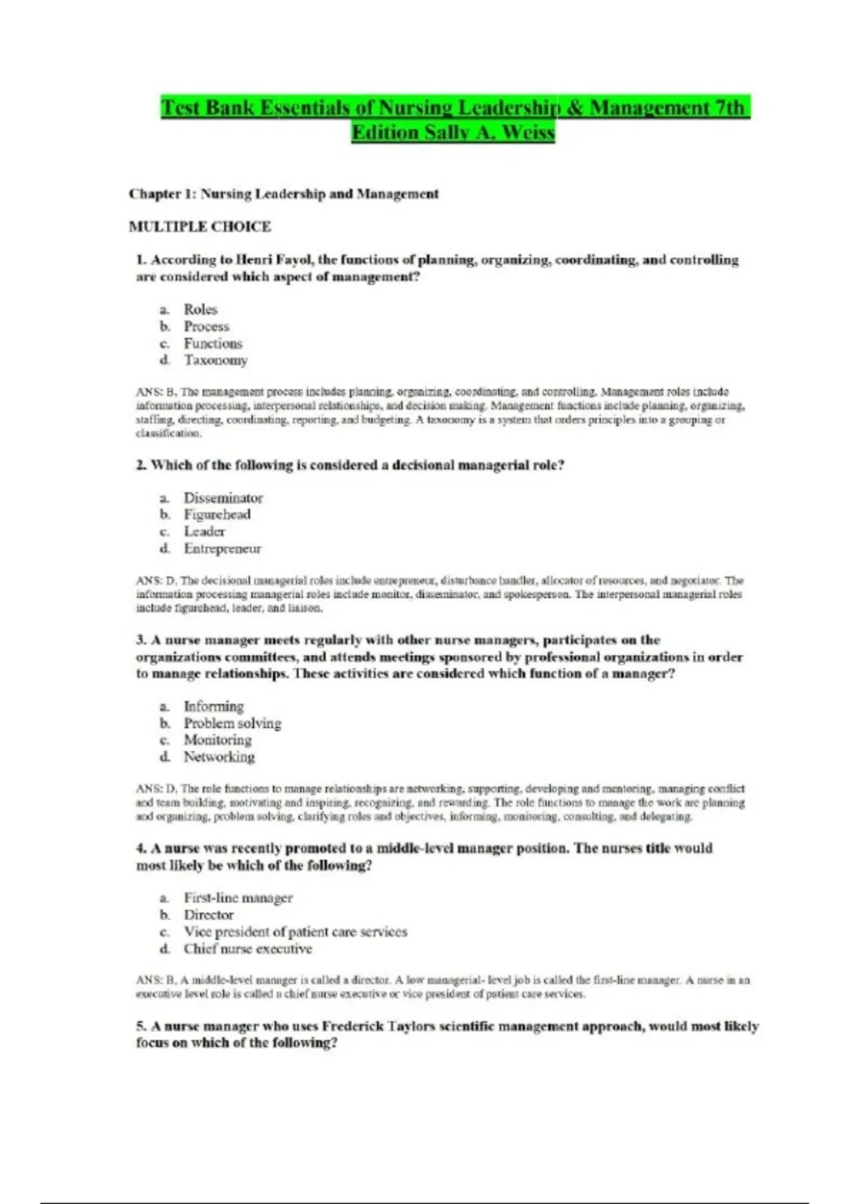 Test Bank Essentials of Nursing Leadership & Management 7th Edition Sally A. Weiss