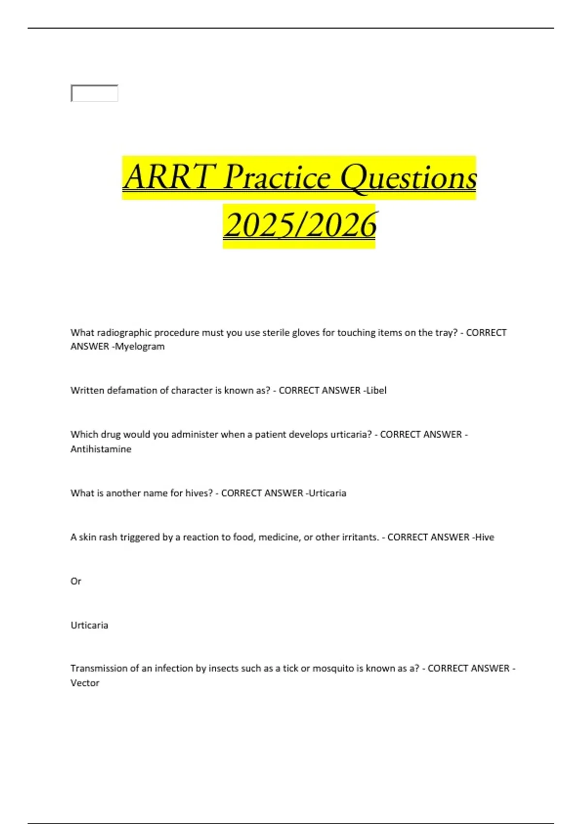 What radiographic procedure must you use sterile gloves for touching items on the tray? - CORRECT ANSWER -Myelogram Written defamation of character is known as? - CORRECT ANSWER -Libel Which drug would you administer when a patient develops urticaria? - CORRECT ANSWER -Antihistamine What is another name for hives? - CORRECT ANSWER -Urticaria
