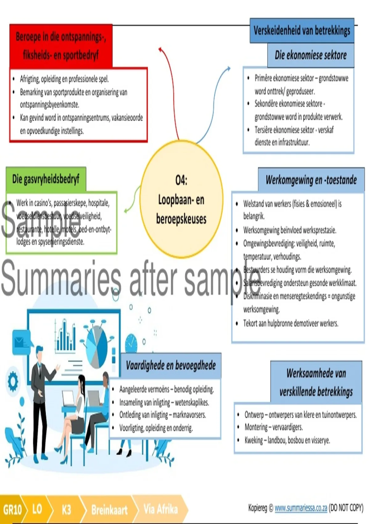 Hierdie produk bevat al die werk vir Lewensoriëntering LO Graad 10, kwartaal 3 en is gebaseer op die “Via Afrika” Handboek in Afrikaans. Graad 10 LO Kwartaal 3 Opsommings Onderwerp 1:  Ontwikkeling van die self in die gemeenskap. Onderwerp 4:  Loopbaan- en beroepskeuses. Onderwerp 6:  Liggaamlike Opvoeding. Pakkette sluit gewoonlik die volgende in, maar kan verskil van produk tot produk: Oorsig vir die kwartaal met hoofpunte, sleutelwoorde en kort opsommings & hersiening. Breinkaart per hoofstuk / onderwerp / kwartaal afhangende van die volume. Uitgebreide opsommings: puntsgewys in kleur met prentjies en / of foto’s.
