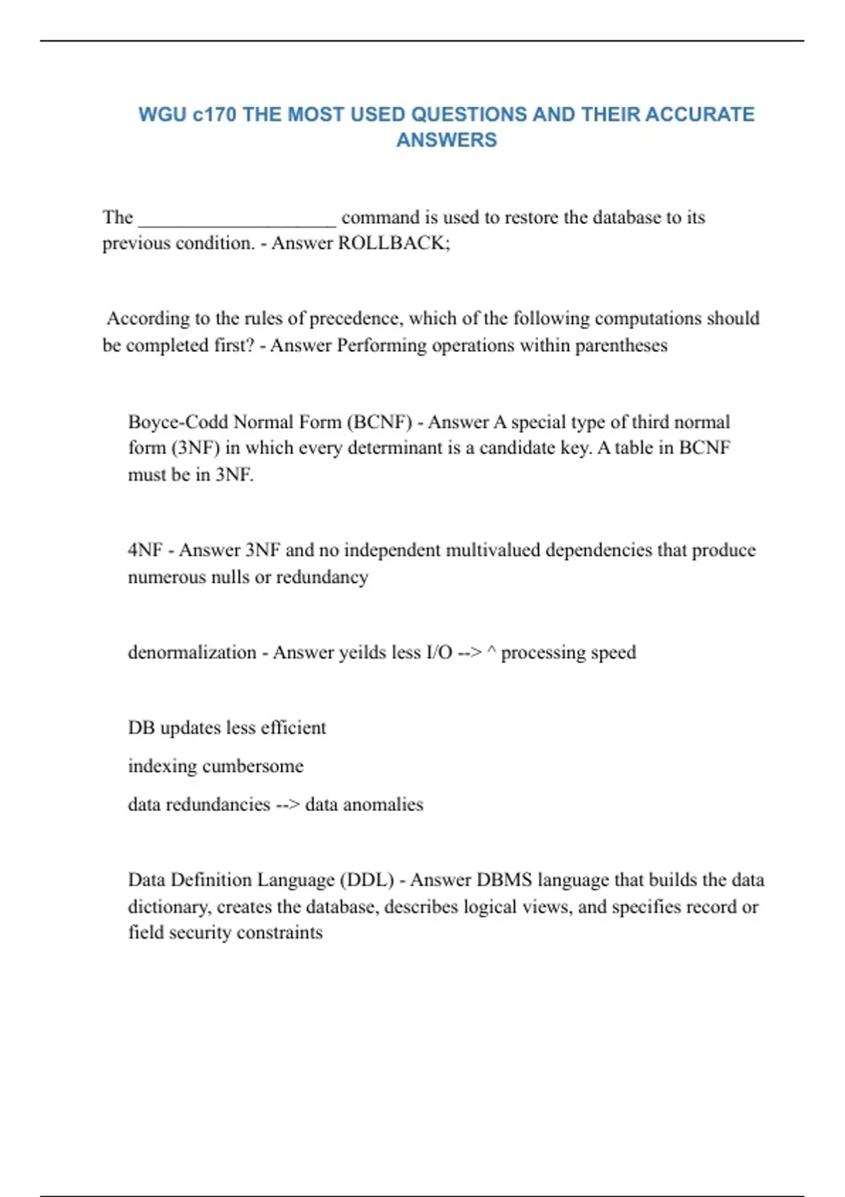 WGU c170 THE STRAIGHT TO THE POINT INFORMATION TECHNOLOGY USED QUESTIONS AND THEIR VERIFIED ANSWERS GRADED + The ____________________ command is used to restore the database to its previous condition. - Answer ROLLBACK; According to the rules of precedence, which of the following computations should be completed first? - Answer Performing operations within parentheses Boyce-Codd Normal Form (BCNF) - Answer A special type of third normal form (3NF) in which every determinant is a candidate key. A table in BCNF must be in 3NF. 4NF - Answer 3NF and no independent multivalued dependencies that produce numerous nulls or redundancy denormalization - Answer yeilds less I/O --> ^ processing speed DB updates less efficient indexing cumbersome data redundancies --> data anomalies Data Definition Language (DDL) - Answer DBMS language that builds the data dictionary, creates the database, describes logical views, and specifies record or field security constraints Data Manipulation Language (DML) - Answer DBMS language that changes database content, including data element creations, updates, insertions, and deletions SELECT, INSERT, UPDATE, DELETE, COMMIT, ROLLBACK WHERE - Answer can be used with SELECT, UPDATE, DELETE in DDL Aggregate Function - Answer COUNT, MIN, MAX, AVG are this type of special function that performs arithmetic computations over a set of rows Used with GROUP BY HAVING - Answer GROUP BY is restricted by this ORDER BY - Answer clause that is used to sort the output of SELECT statement in ascending or descending Join - Answer operation that is performed every time you specify two or more tables in the FROM clause and use a join condition in the WHERE *if you forget this /Cartesian prodct/ automatically used* Operational Data - Answer structured for fast and reliable transaction processing not for decision support Decision Support Data - Answer differs from operational data in 3 ways: time span, granularity, dimensionality Data warehouse - Answer read-only database optimized for data analysis and query processing data mart - Answer small, single-subject data warehouse subset that provides decision support to a small group of people volume, velocity, variety - Answer 3 Vs of Big Data DBs Abstract data type - Answer data type that describes a set of similar objects with shared and encapsulated data representation and methods used to describe complex objects analytical database - Answer db focused primarily of storing historical data and business metrics used for tactical or strategic decision making cascading order sequence - Answer a nested ordering sequence for a set of rows, such as a list in which all last names are alphabetically ordered and, withing the last names all first names are ordered class - Answer a collection of similar objects with shared strx (attr) and behavior (methods) encapsulates obj data rep and a method's implementation organized in a hierarchy class diagram - Answer diagram used to rep data and their rlxns in UML obj notation conceptual model - Answer provides global view of an entire DB and describes the main data obj, avoiding details conceptual schema - Answer rep of the conceptual model, usually expressed graphically COUNT - Answer SQL aggregate fxn that outputs number of rows containing not null vals for a given col or expression sometimes used with DISTINCT data anomaly - Answer data abnormality which inconsistent changes have been made to DB data cube - Answer based on x-, y-, z-axes; static (no ad hoc queries allowed) data node - Answer one of the 3 types of nodes in Hadoop Distributed File System that stores fixed-size data blocks (that can be replicated) derived attribute - Answer attr that does not physically exist within the entity and is derived via an algorithm dimension tables - Answer In a data warehouse, tables used to search, filter, or classify facts within a star schema domain - Answer in data modeling, the construct used to organize and describe an attr set of possible vals enitity relationship diagram (ERD) - Answer reps ERM ents, attr, rlxns Entity relationship model - Answer 1:1, 1:M, M;N model Extensible Mark - Answer meta-lang used to rep and manipulate data elements field - Answer alphabetic or numeric char group or group of char that definsed a char of a noun file - Answer named collection of related records granularity - Answer level of detail rep by the vals stored in a table's row; lowest level --> atomic GROUP BY - Answer SQL clause used to create frequency dists when combined with any of the aggregate fxn in SELECT statement Hadoop - Answer java based, OSource, high speed, fault-tolerant dist storage and computational framework uses low-cost hardware to create clusters of thousands of comp nodes to store and process data Hadoop Distributed File System (HDFS) - Answer highly dist, falut-tolerant, file storage syst designed to manage lg amounts of data at high speeds islands of information - Answer in the old file system environment, pools of independent, duplicated, inconsistent data created and managed by diff depts linking table - Answer in the relational model, a table that implements an M:M rlxn MapReduce - Answer An open-source application programming interface (API) that provides fast data analytics services; one of the main Big Data technologies that allows organizations to process massive data stores. MDBMSs (multidimensional; online --> MOLAP) - Answer database mgmt sys that used proprietary techniques to store data in matrixlike arrays of n dimensions known as cubes nonprime attribute - Answer atrr that is not part of a key normalization - Answer process that assigns attr to entities so that data redundancies are reduced or eliminated predicate logic - Answer used in math to provide a framework in which an assertion (statement or fact) can be verified as either T/F recursive relationship - Answer rlxn found within a single entity type roll up - Answer (1) To aggregate data into summarized components, that is, higher le