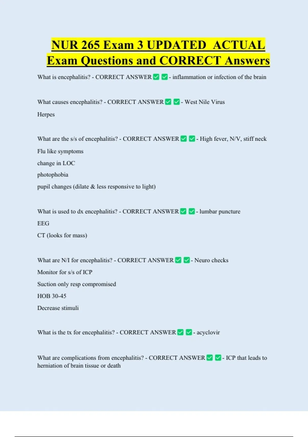 NUR 265 Exam 3 UPDATED ACTUAL Exam Questions and CORRECT Answers What is encephalitis? - CORRECT ANSWER What causes encephalitis? - CORRECT ANSWER Herpes - inflammation or infection of the brain - West Nile Virus What are the s/s of encephalitis? - CORRECT ANSWER Flu like symptoms change in LOC photophobia pupil changes (dilate & less responsive to ligh