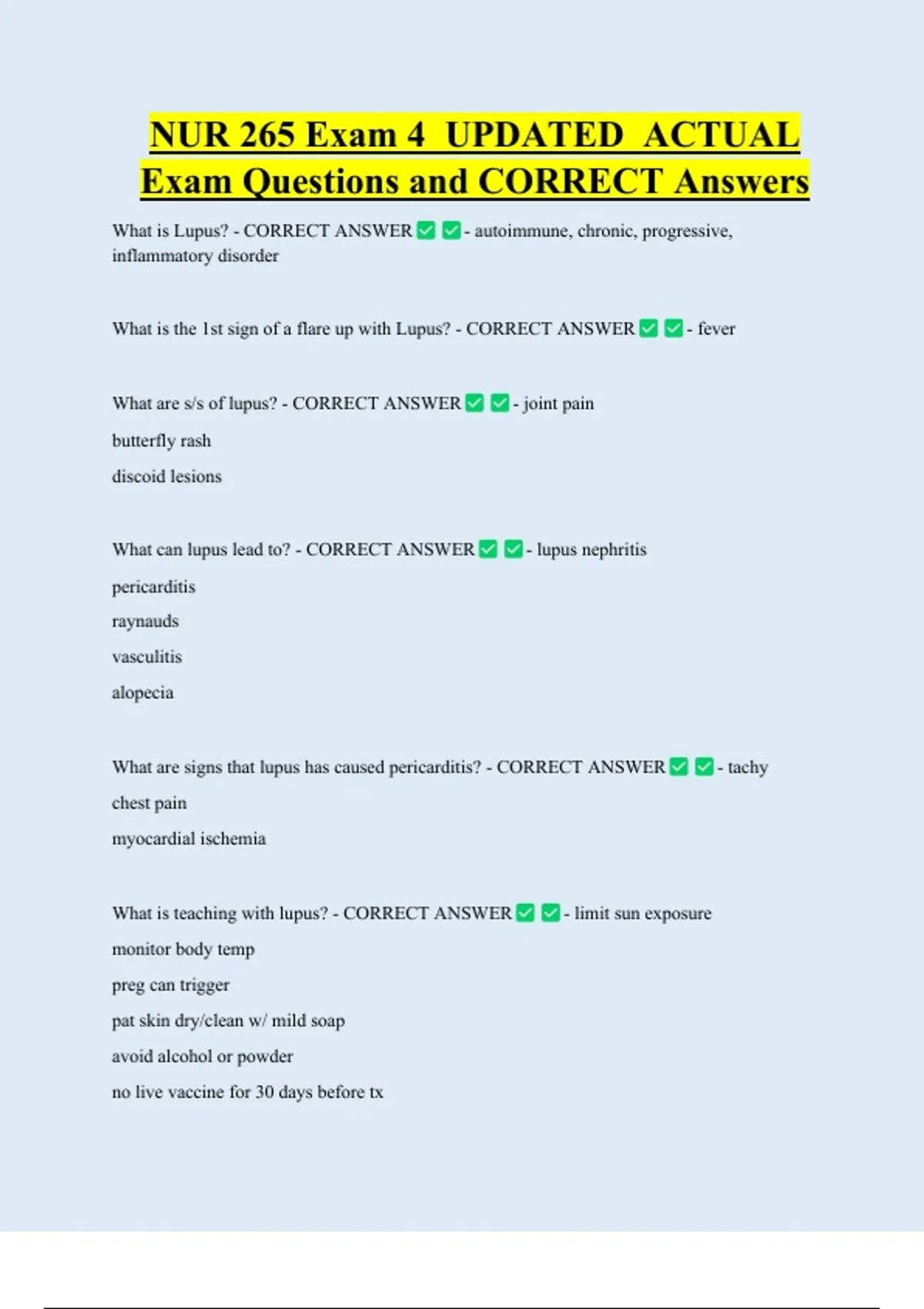 NUR 265 Exam 4 UPDATED ACTUAL Exam Questions and CORRECT Answers What is Lupus? - CORRECT ANSWER inflammatory disorder - autoimmune, chronic, progressive, What is the 1st sign of a flare up with Lupus? - CORRECT ANSWER What are s/s of lupus? - CORRECT ANSWER butterfly rash discoid lesions What can lupus lead to? - CORRECT ANSWER pericarditis raynauds vasculitis alopecia - joint pain