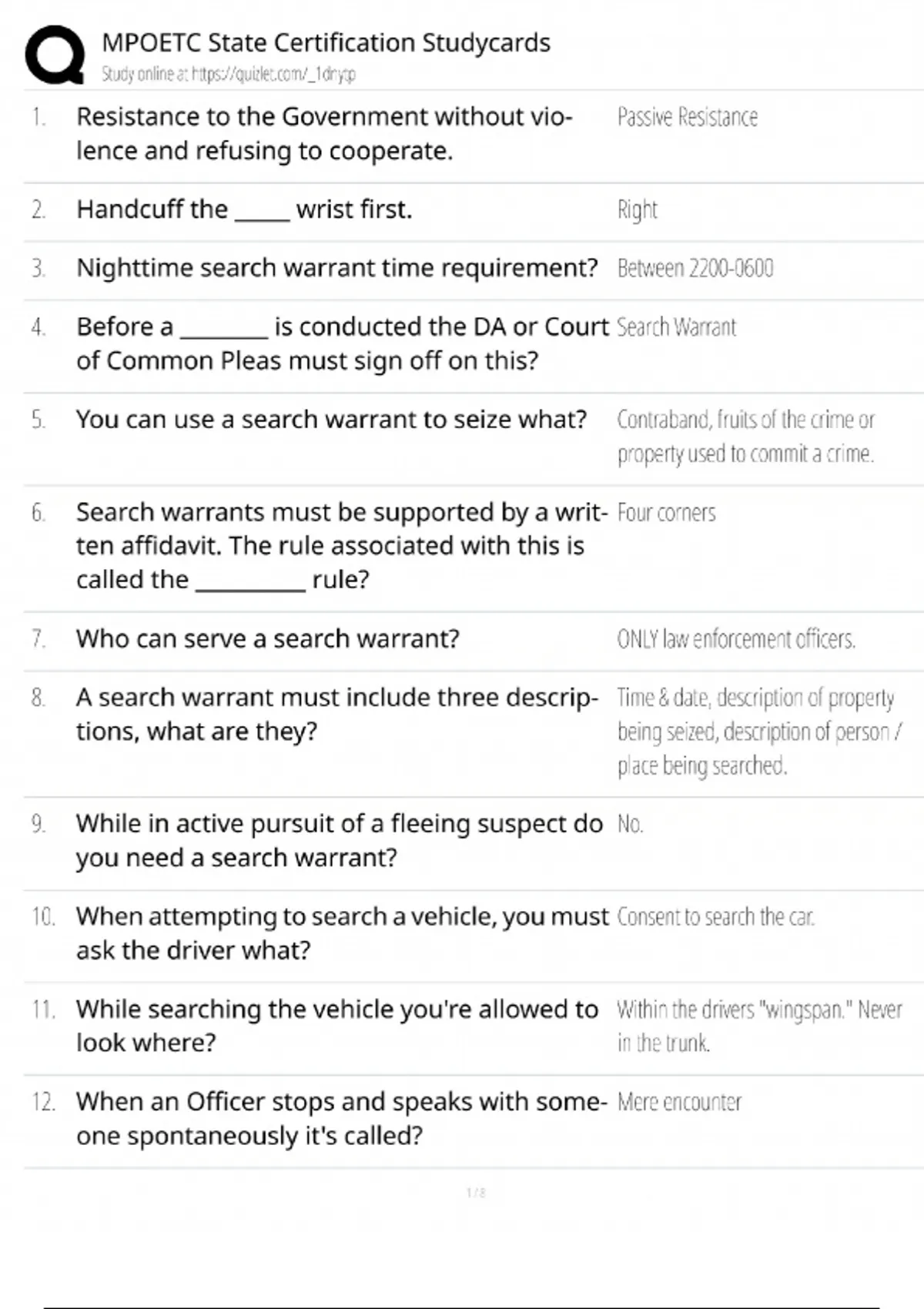 Ace your MPOETC (Municipal Police Officers' Education and Training Commission) State Certification exam with our 2025 updated flashcard studyset. This essential resource is designed for Pennsylvania police recruits, officers, and law enforcement professionals preparing for certification. It covers all critical domains: Pennsylvania crimes code, vehicle code, patrol procedures, use of force, ethics, and criminal procedure. Master the material with key term flashcards, scenario-based questions, and legal definitions to score 100% on your MPOETC exam.