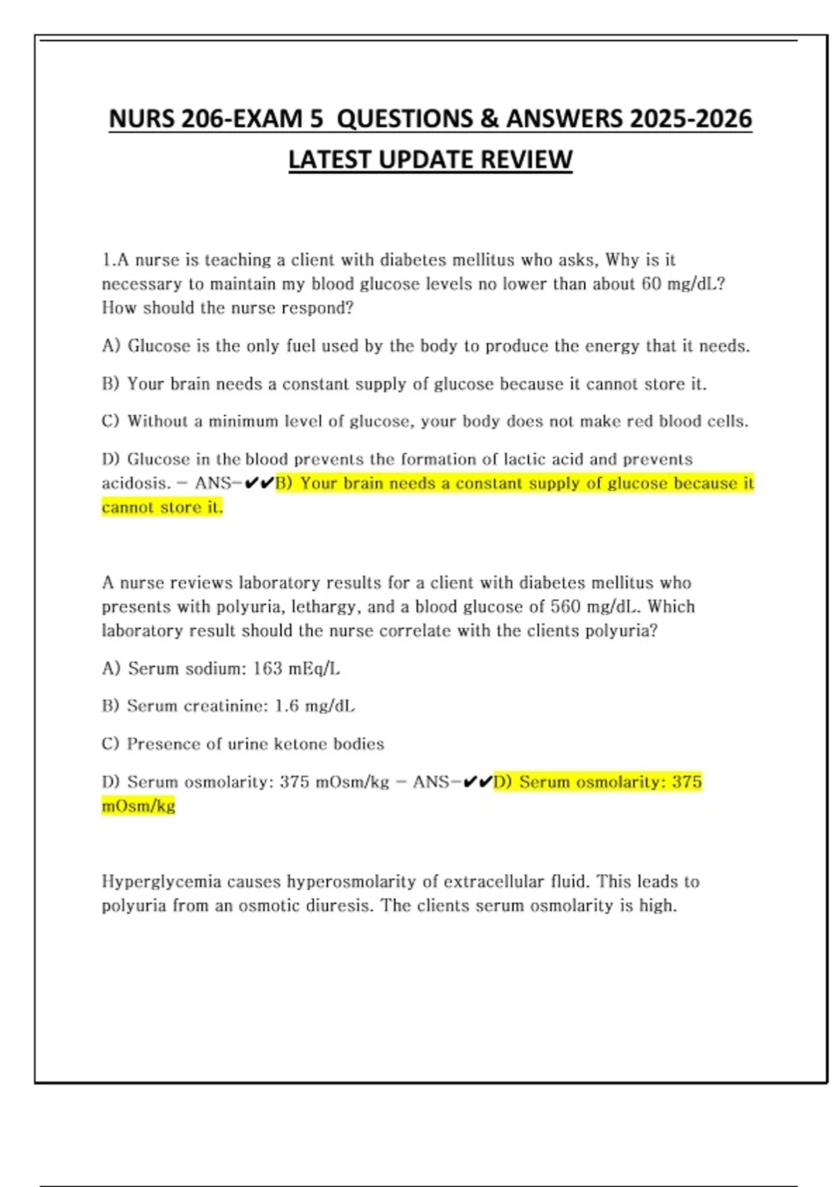 NURS 206-EXAM 5 QUESTIONS & ANSWERS LATEST UPDATE REVIEW 1.A nurse is teaching a client with diabetes mellitus who asks, Why is it necessary to maintain my blood glucose levels no lower than about 60 mg/dL? How should the nurse respond? A) Glucose is the only fuel used by the body to produce the energy that it needs. B) Your brain needs a constant supply of glucose because it cannot store it. C) Without a minimum level of glucose, your body does not make red blood cells. D) Glucose in the blood prevents the formation of lactic acid and prevents acidosis. - ANS-B) Your brain needs a constant supply of glucose because it cannot store it. A nurse reviews laboratory results for a client with diabetes mellitus who presents with polyuria, lethargy, and a blood glucose of 560 mg/dL. Which laboratory result should the nurse correlate with the clients polyuria? A) Serum sodium: 163 mEq/L B) Serum creatinine: 1.6 mg/dL C) Presence of urine ketone bodies D) Serum osmolarity: 375 mOsm/kg - ANS-D) Serum osmolarity: 375 mOsm/kg Hyperglycemia causes hyperosmolarity of extracellular fluid. This leads to polyuria from an osmotic diuresis. The clients serum osmolarity is high. .After teaching a young adult client who is newly diagnosed with type 1 diabetes mellitus, the nurse assesses the clients understanding. Which statement made by the client indicates a correct understanding of the need for eye examinations? A) At my age, I should continue seeing the ophthalmologist as I usually do. B) I will see the eye doctor when I have a vision problem and yearly after age C) My vision will change quickly. I should see the ophthalmologist twice a year. D) Diabetes can cause blindness, so I should see the ophthalmologist yearly. - ANS-...