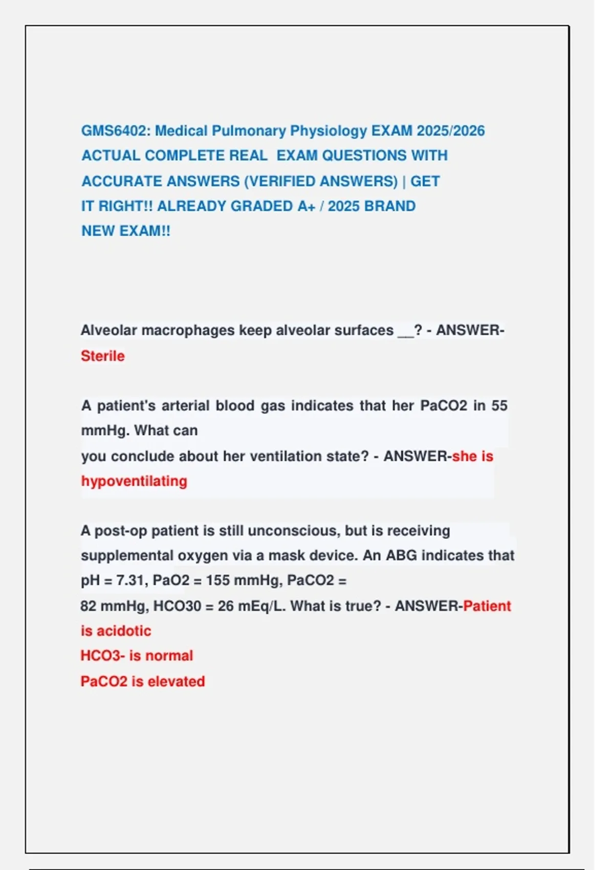 GMS6402: Medical Pulmonary Physiology EXAM 2025/2026 ACTUAL COMPLETE REAL EXAM QUESTIONS WITH ACCURATE ANSWERS (VERIFIED ANSWERS) | GET IT RIGHT!! ALREADY GRADED A+ / 2025 BRAND NEW EXAM!! GMS6402: Medical Pulmonary Physiology EXAM 2025/2026 ACTUAL COMPLETE REAL EXAM QUESTIONS WITH ACCURATE ANSWERS (VERIFIED ANSWERS) | GET IT RIGHT!! ALREADY GRADED A+ / 2025 BRAND NEW EXAM!! GMS6402: Medical Pulmonary Physiology EXAM 2025/2026 ACTUAL COMPLETE REAL EXAM QUESTIONS WITH ACCURATE ANSWERS (VERIFIED ANSWERS) | GET IT RIGHT!! ALREADY GRADED A+ / 2025 BRAND NEW EXAM!! GMS6402: Medical Pulmonary Physiology EXAM 2025/2026 ACTUAL COMPLETE REAL EXAM QUESTIONS WITH ACCURATE ANSWERS (VERIFIED ANSWERS) | GET IT RIGHT!! ALREADY GRADED A+ / 2025 BRAND NEW EXAM!! GMS6402: Medical Pulmonary Physiology EXAM 2025/2026 ACTUAL COMPLETE REAL EXAM QUESTIONS WITH ACCURATE ANSWERS (VERIFIED ANSWERS) | GET IT RIGHT!! ALREADY GRADED A+ / 2025 BRAND NEW EXAM!! GMS6402: Medical Pulmonary Physiology EXAM 2025/2026 ACTUAL COMPLETE REAL EXAM QUESTIONS WITH ACCURATE ANSWERS (VERIFIED ANSWERS) | GET IT RIGHT!! ALREADY GRADED A+ / 2025 BRAND NEW EXAM!!