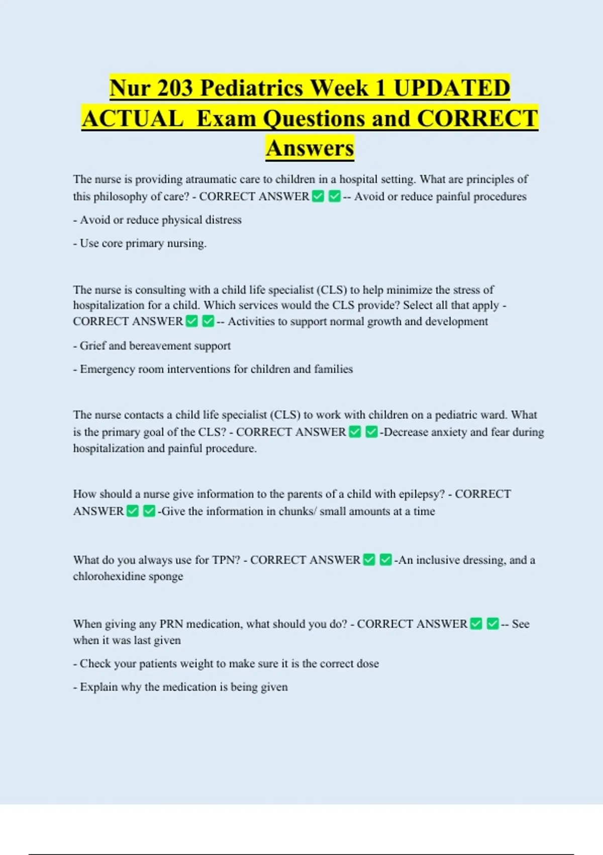 Nur 203 Pediatrics Week 1 UPDATED ACTUAL Exam Questions and CORRECT Answers
