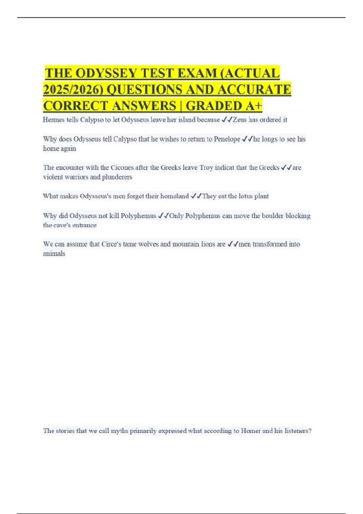 THE ODYSSEY TEST EXAM (ACTUAL 2025/2026) QUESTIONS AND ACCURATE CORRECT ANSWERS | GRADED A+ Hermes tells Calypso to let Odysseus leave her island because Zeus has ordered it Why does Odysseus tell Calypso that he wishes to return to Penelope he longs to see his home again The encounter with the Cicones after the Greeks leave Troy indicat that the Greeks are violent warriors and plunderers What makes Odysseus's men forget their homeland They eat the lotus plant Why did Odysseus not kill Polyphemus Only Polyphemus can move the boulder blocking the cave's entrance We can assume that Circe's tame wolves and mountain lions are men transformed into animals
