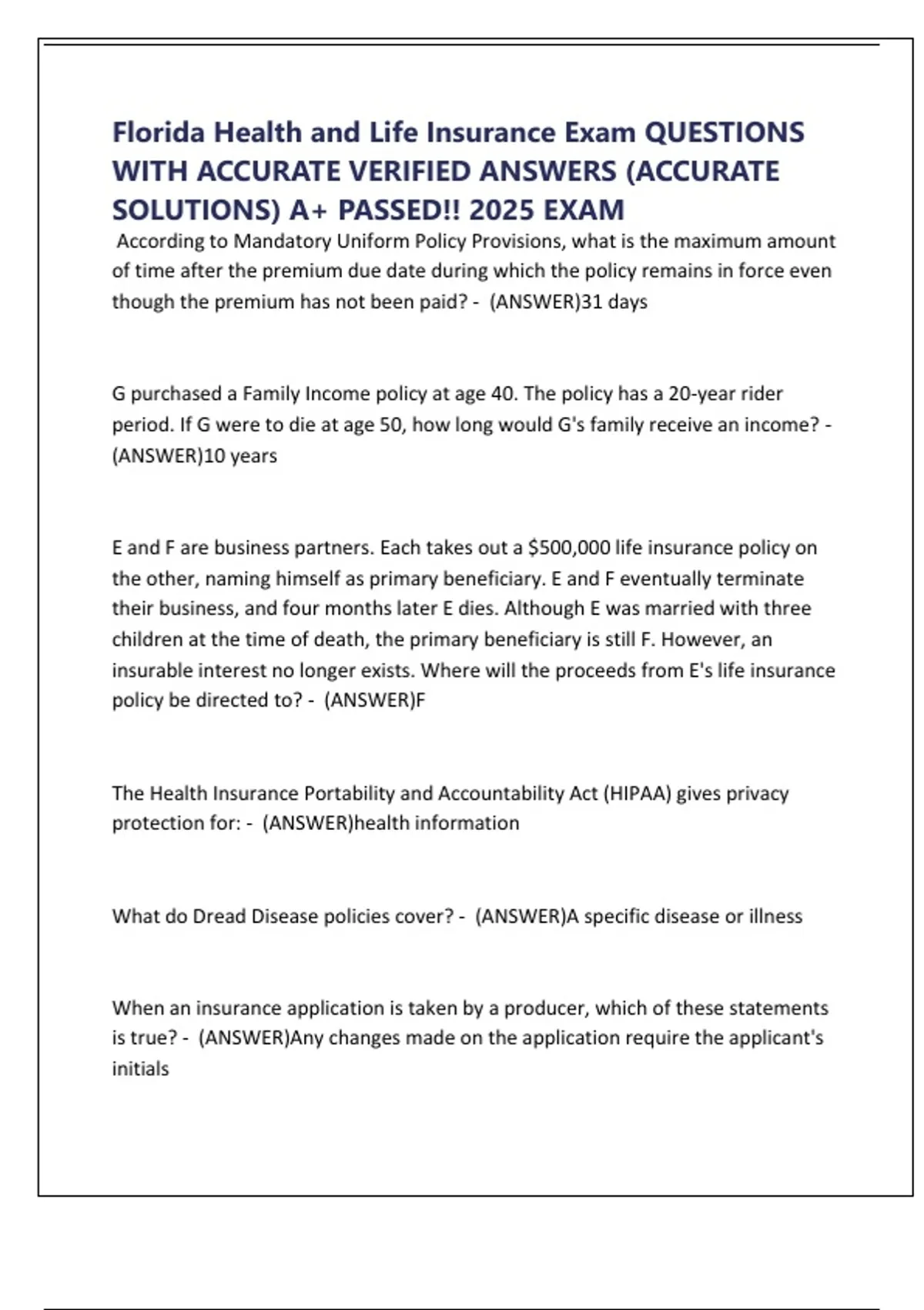 Florida Health and Life Insurance Exam QUESTIONS WITH ACCURATE VERIFIED ANSWERS (ACCURATE SOLUTIONS) A+ PASSED!! 2025 EXAM