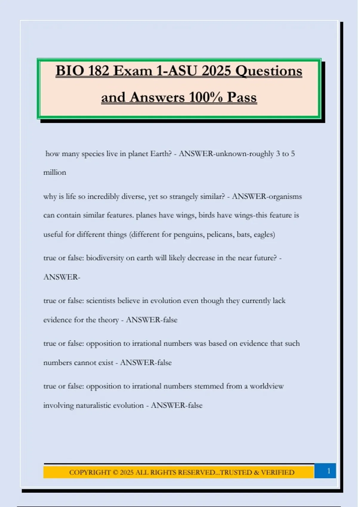 BIO 182 Exam 1-ASU 2025 Questions