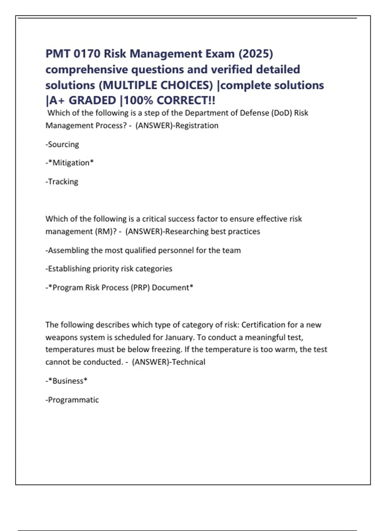 PMT 0170 Risk Management Exam (2025) comprehensive questions and verified detailed solutions (MULTIPLE CHOICES) |complete solutions |A+ GRADED |100% CORRECT!!