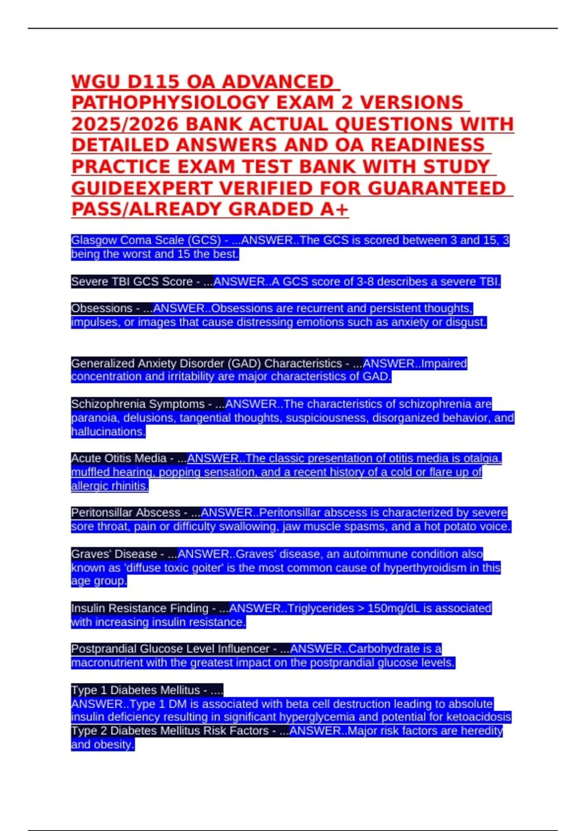 WGU D115 OA ADVANCED PATHOPHYSIOLOGY EXAM 2 VERSIONS 2025/2026 BANK ACTUAL QUESTIONS WITH DETAILED ANSWERS AND OA READINESS PRACTICE EXAM TEST BANK WITH STUDY GUIDEEXPERT VERIFIED FOR GUARANTEED PASS/ALREADY GRADED A+