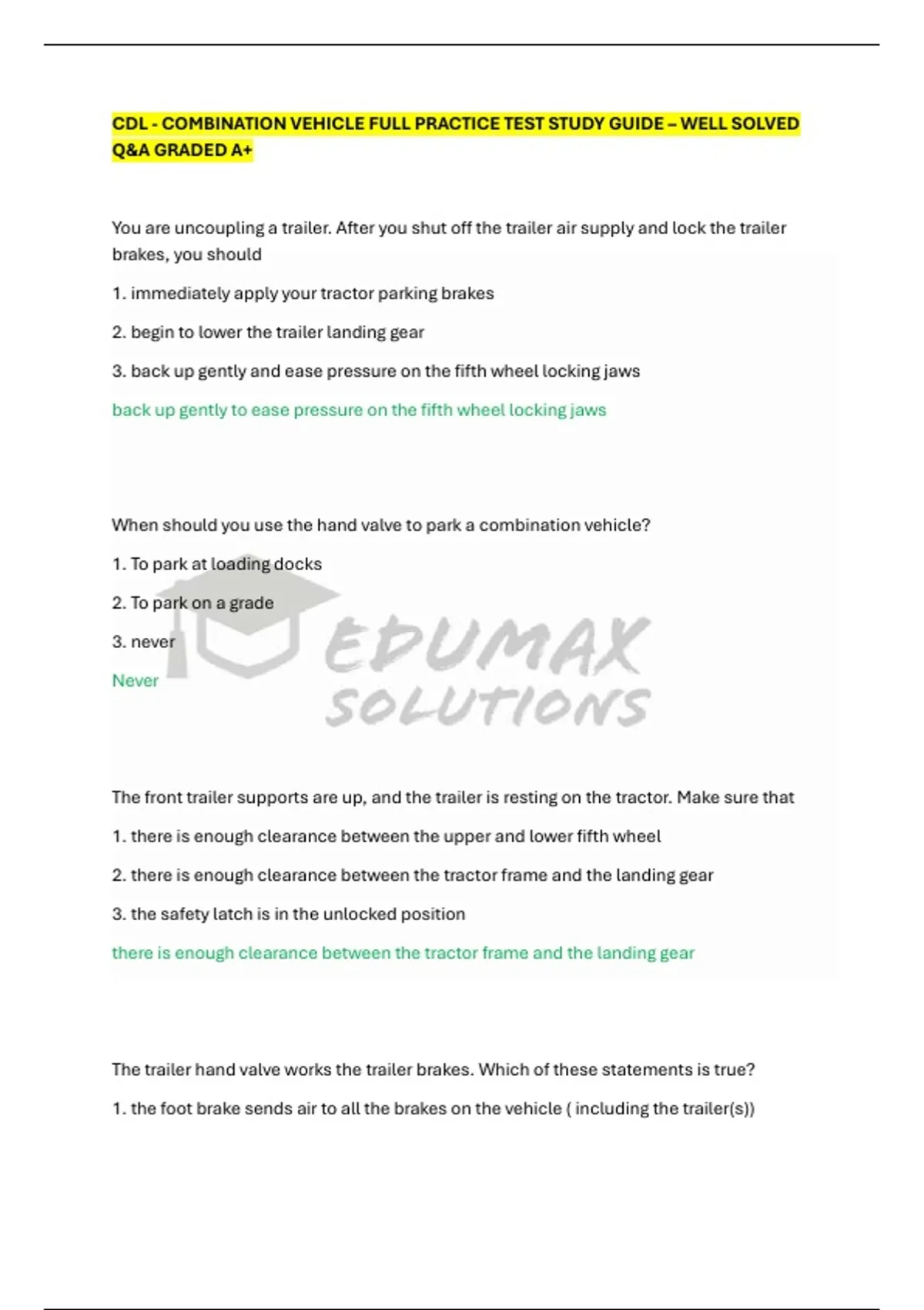 CDL - COMBINATION VEHICLE FULL PRACTICE TEST STUDY GUIDE – WELL SOLVED