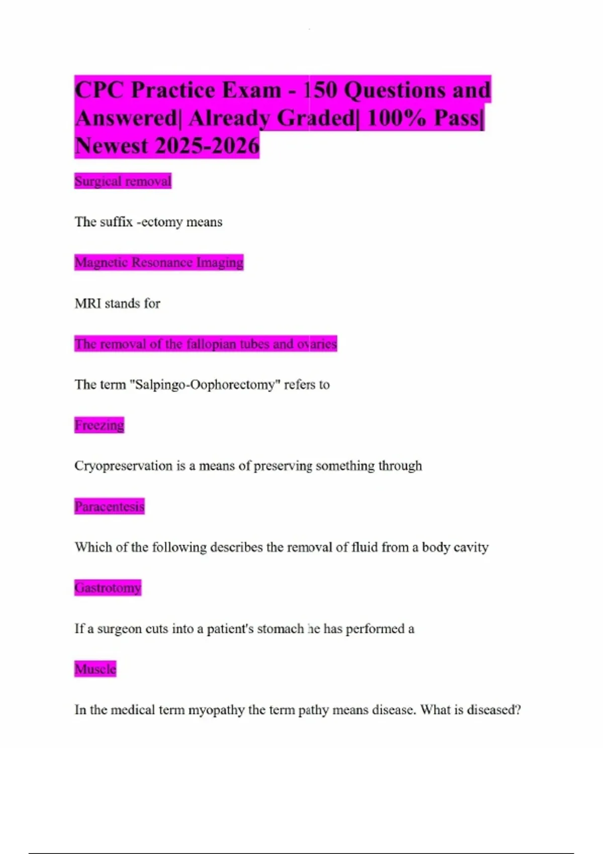 CPC Practice Exam - 150 Questions and Answered| Already Graded| 100% Pass| Newest Surgical removal The suffix -ectomy means Magnetic Resonance Imaging MRI stands for The removal of the fallopian tubes and ovaries The term "Salpingo-Oophorectomy" refers to Freezing Cryopreservation is a means of preserving something through Paracentesis Which of the following describes the removal of fluid from a body cavity Gastrotomy If a surgeon cuts into a patient's stomach he has performed a Muscle In the medical term myopathy the term pathy means disease. What is diseased? Measles, Mumps, Rubella, and Varicella The acronym MMRV stands for Outer bone located in the forearm The Radius is the Hemic and Lymphatic The spleen belongs to what organ system? The distal portion The portion of the femur bone that helps makes up the knee cap is considered what? Middle The Midsagittal plane refers to what portion of the body? Cecum Which of the following is not part of the small intestine? Teres One of the six major scapulohumeral muscles Where to esophagus joins the stomach The cardia fundus is Amputation, arm through humerus; secondary closure or scar revision The full description of CPT code 24925 is: The condition of the patient justifies the service provided Medical necessity means what? 45392 Which of the following codes allows the use of modifier 51? It helps cover outpatient charges Which of the following statements is not true regarding Medicare Part A External cause codes are only used in the initial encounter. Which of the following statements is false? Exploration, including enlargement, debridement, removal of foreign body(ies), minor vessel ligation, and repair Wound exploration codes include the following service (s) : I12.9, N18.3 What is the correct ICD-10-CM code(s) for malignant hypertension with stage III kidney disease? S51.822A, W07.XXXA, W25.XXXA, Y93.E9, Y92.030 Lucy was standing on a chair in her apartment's kitchen trying to change a light bulb when she slipped and fell. She struck the glass top stove, which shattered. She presents to the ER with a simple laceration to her left forearm that has embedded glass particles. Which is the correct code(s)? T20.30XA, T24.319A, T22.299A, T31.42, X03.0XXA Jim was at a bonfire when he tripped and fell into the flames and sustained multiple burns. He came to the emergency room via an ambulance and was treated for second and third degree burns on his face, second degree burns on his upper arms and forearms, and third degree burns on the fronts of his thighs Which is the correct code(s)?