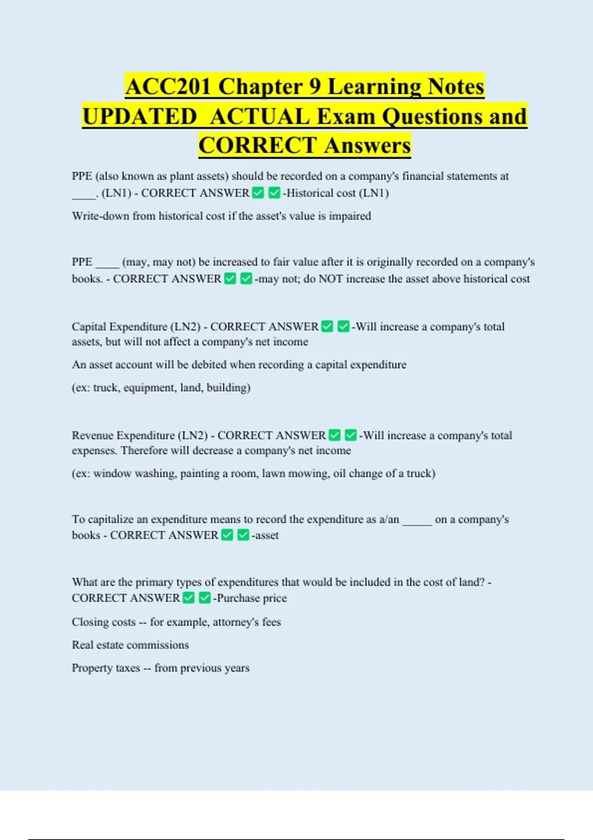 ACC201 Chapter 9 Learning Notes UPDATED ACTUAL Exam Questions and CORRECT Answers PPE (also known as plant assets) should be recorded on a company's financial statements at ____. (LN1) - CORRECT ANSWER -Historical cost (LN1) Write-down from historical cost if the asset's value is impaired PPE ____ (may, may not) be increased to fair value after it is originally recorded on a company's books. - CORRECT ANSWER -may not; do NOT increase the asset above historical cost
