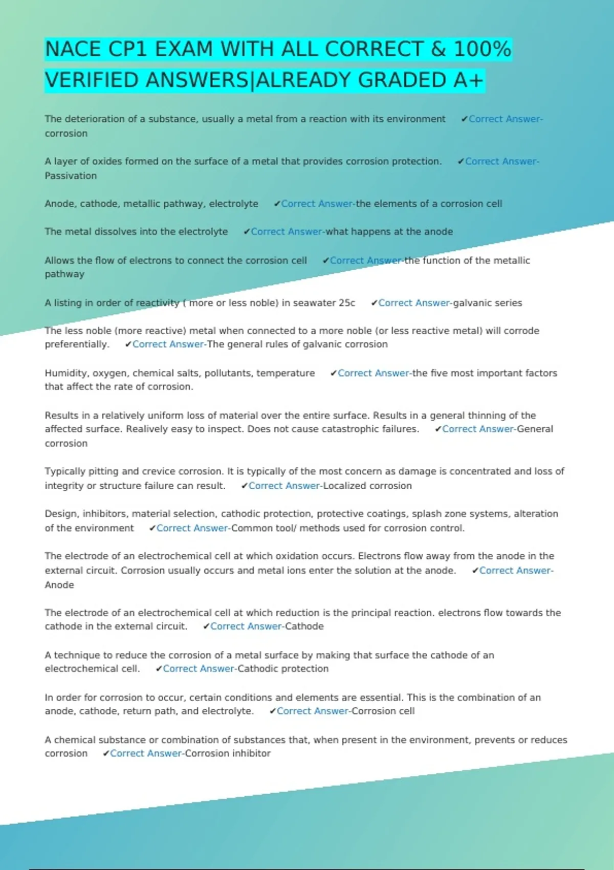 NACE CP1 EXAM WITH ALL CORRECT & 100% VERIFIED ANSWERS|ALREADY GRADED A+