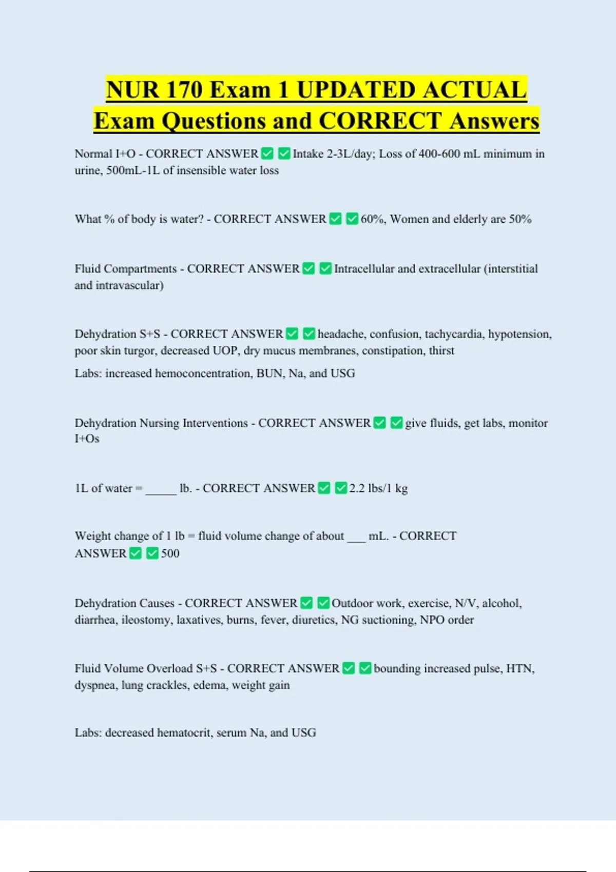 NUR 170 Exam 1 UPDATED ACTUAL Exam Questions and CORRECT Answers Normal I+O - CORRECT ANSWER urine, 500mL-1L of insensible water loss Intake 2-3L/day; Loss of 400-600 mL minimum in What % of body is water? - CORRECT ANSWER Fluid Compartments - CORRECT ANSWER and intravascular) Dehydration S+S - CORRECT ANSWER 60%, Women and elderly are 50% Intracellular and extracellular (interstitial headache, confusion, tachycardia, hypotension, poor skin turgor, decreased UOP, dry mucus membranes, constipation, thirst Labs: increased hemoconcentration, BUN, Na, and US