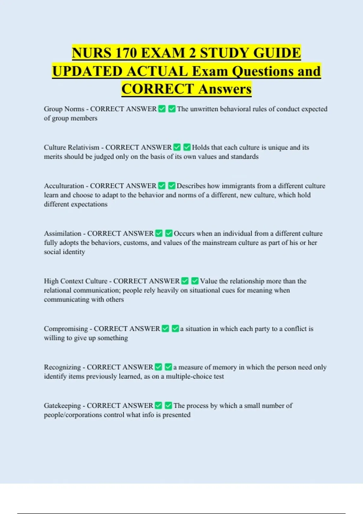 NURS 170 EXAM 2 STUDY GUIDE UPDATED ACTUAL Exam Questions and CORRECT Answers Group Norms - CORRECT ANSWER of group members Culture Relativism - CORRECT ANSWER The unwritten behavioral rules of conduct expected Holds that each culture is unique and its merits should be judged only on the basis of its own values and standards