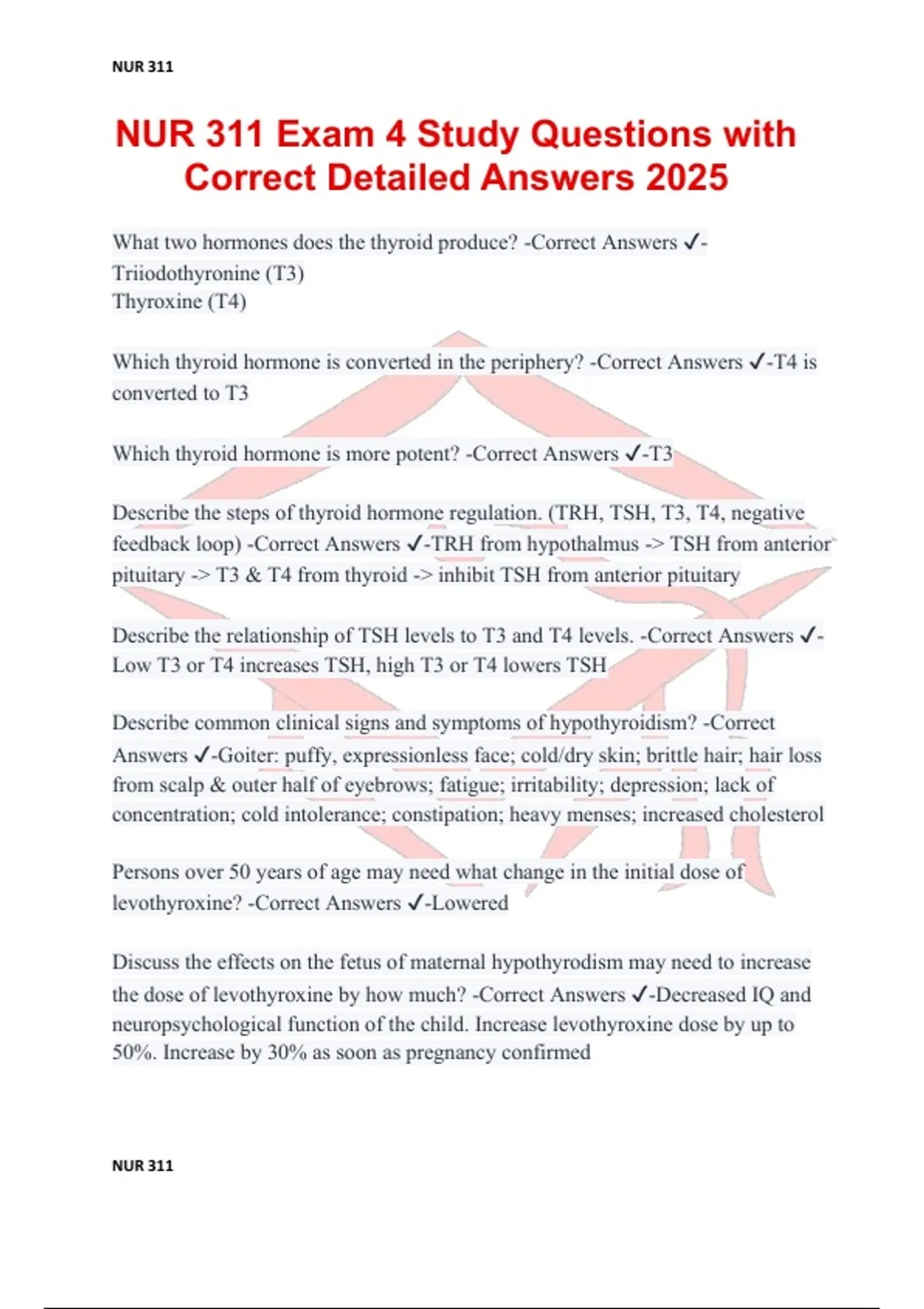 NUR 311 Exam 4 Study Questions with