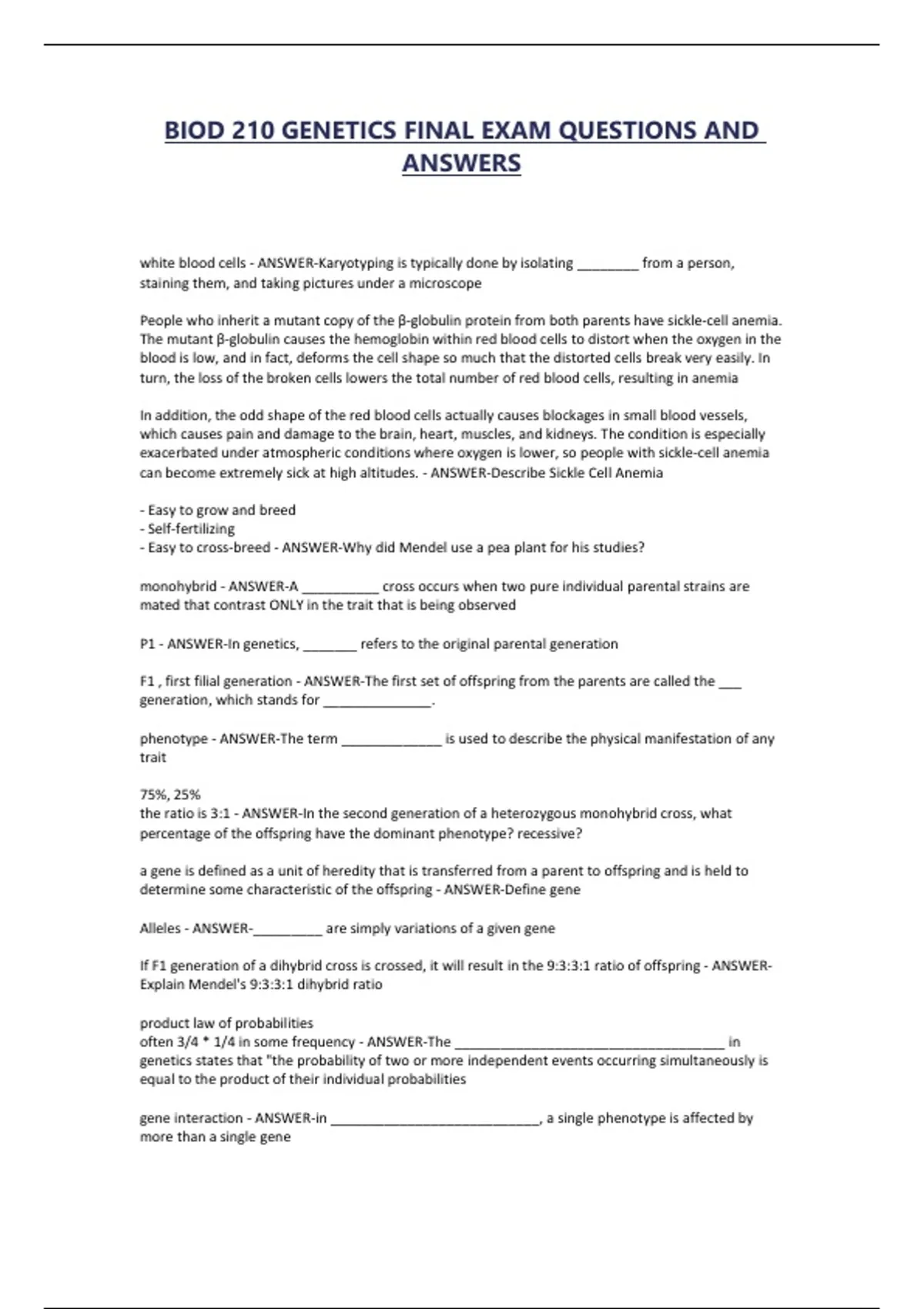 BIOD 210 GENETICS FINAL EXAM QUESTIONS AND