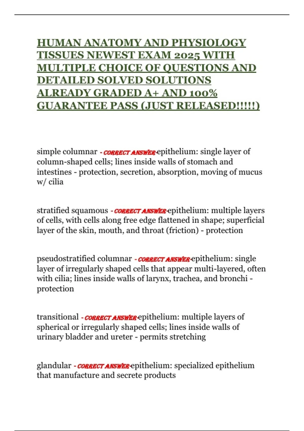HUMAN ANATOMY AND PHYSIOLOGY TISSUES NEWEST EXAM 2025 WITH MULTIPLE CHOICE OF QUESTIONS AND DETAILED SOLVED SOLUTIONS ALREADY GRADED A+ AND 100% GUARANTEE PASS (JUST RELEASED!!!!!)