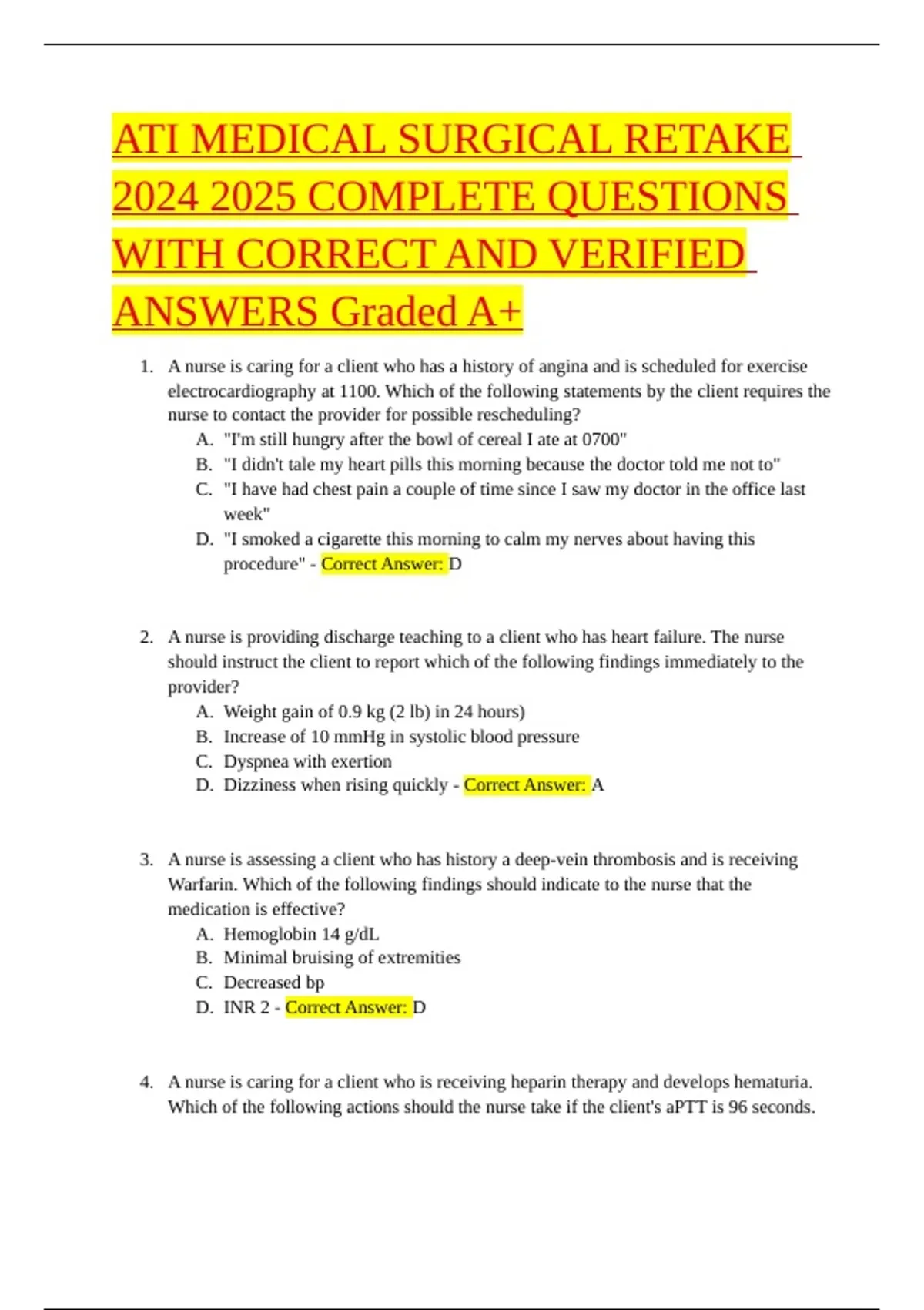 1. A nurse is caring for a client who has a history of angina and is scheduled for exercise