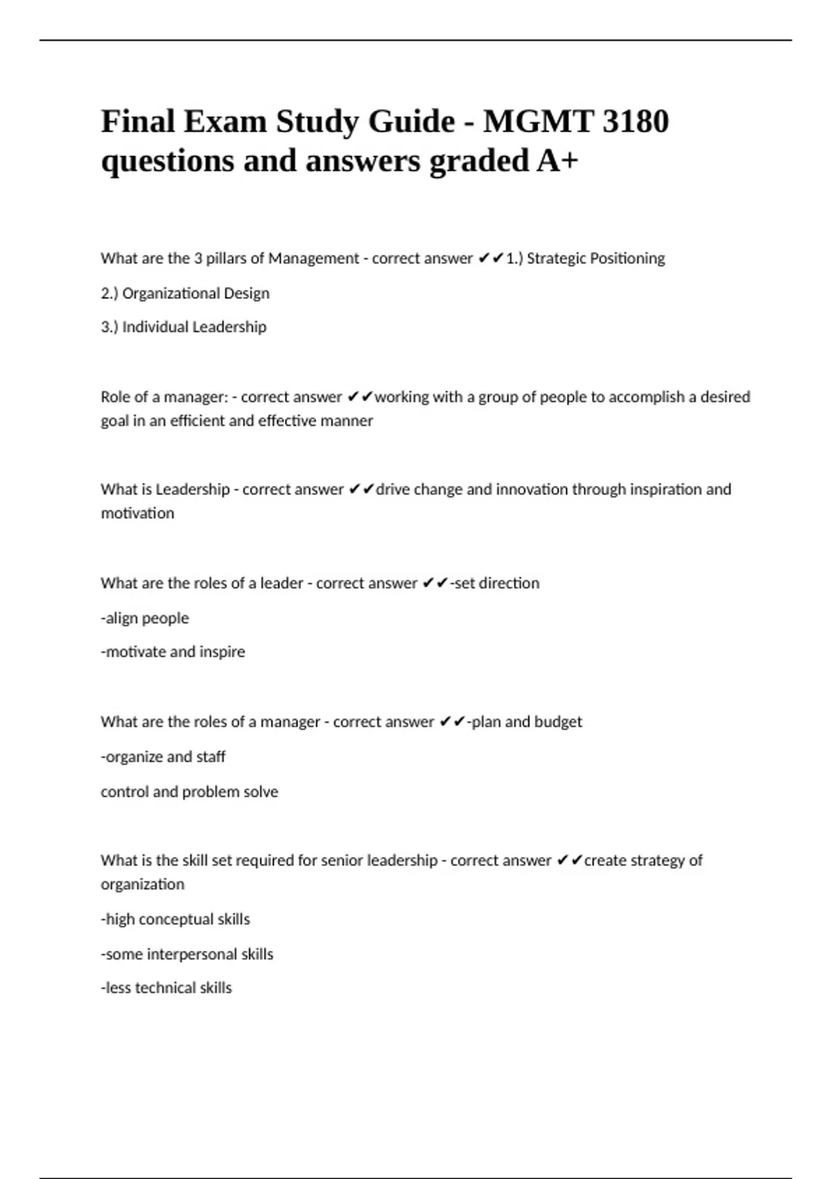 Final Exam Study Guide - MGMT 3180 questions and answers graded A+What are the 3 pillars of Management - correct answer 1.) Strategic Positioning 2.) Organizational Design 3.) Individual Leadership Role of a manager: - correct answer working with a group of people to accomplish a desired goal in an efficient and effective manner What is Leadership - correct answer drive change and innovation through inspiration and motivation What are the roles of a leader - correct answer -set direction -align people -motivate and inspire What are the roles of a manager - correct answer -plan and budget -organize and staff control and problem solve What is the skill set required for senior leadership - correct answer create strategy of organization -high conceptual skills -some interpersonal skills