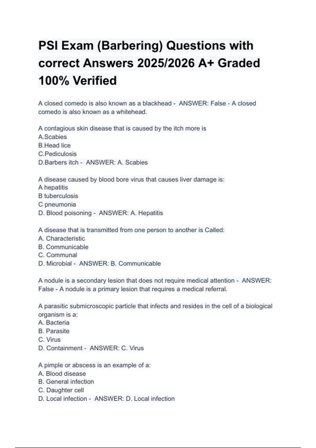 PSI Exam (Barbering) Questions with
