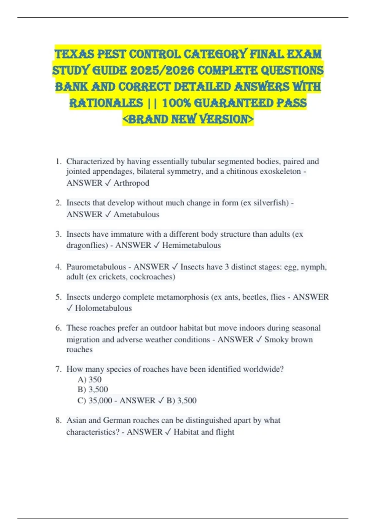 4. Paurometabulous - ANSWER ✓ Insects have 3 distinct stages: egg, nymph,