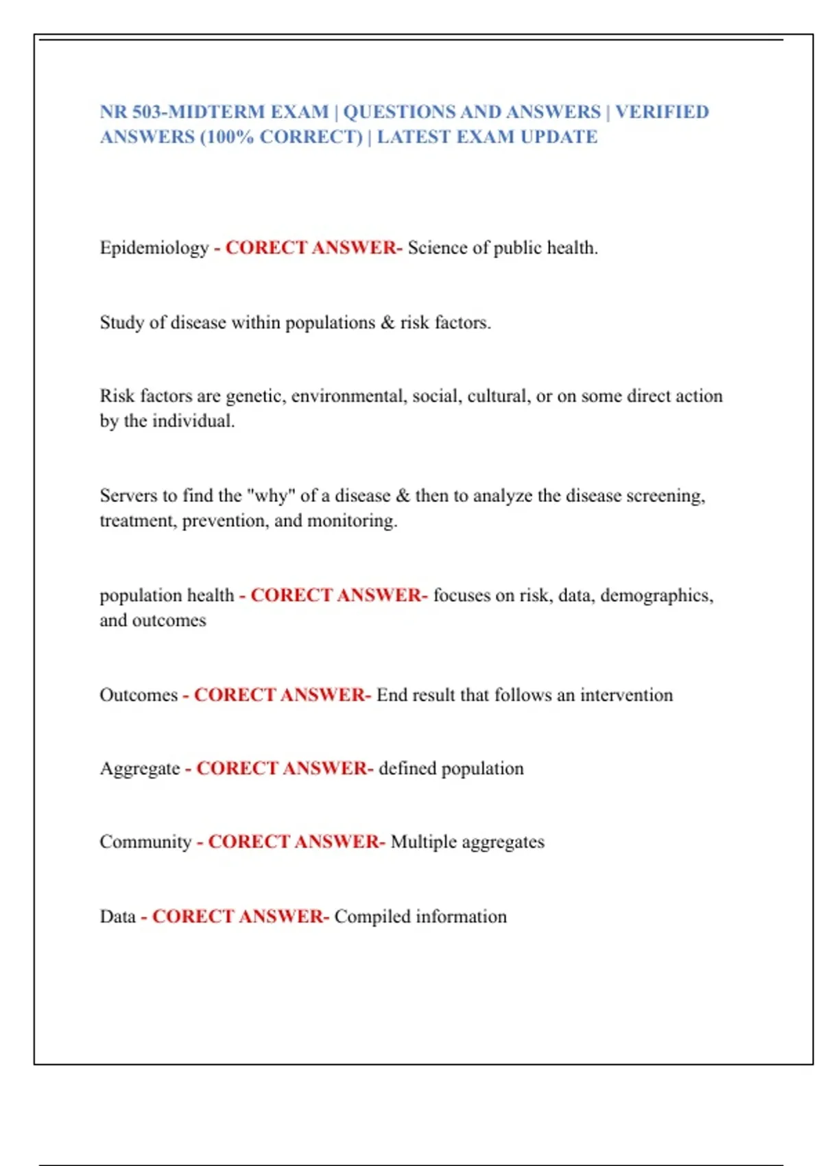 population health - CORECT ANSWER- focuses on risk, data, demographics,