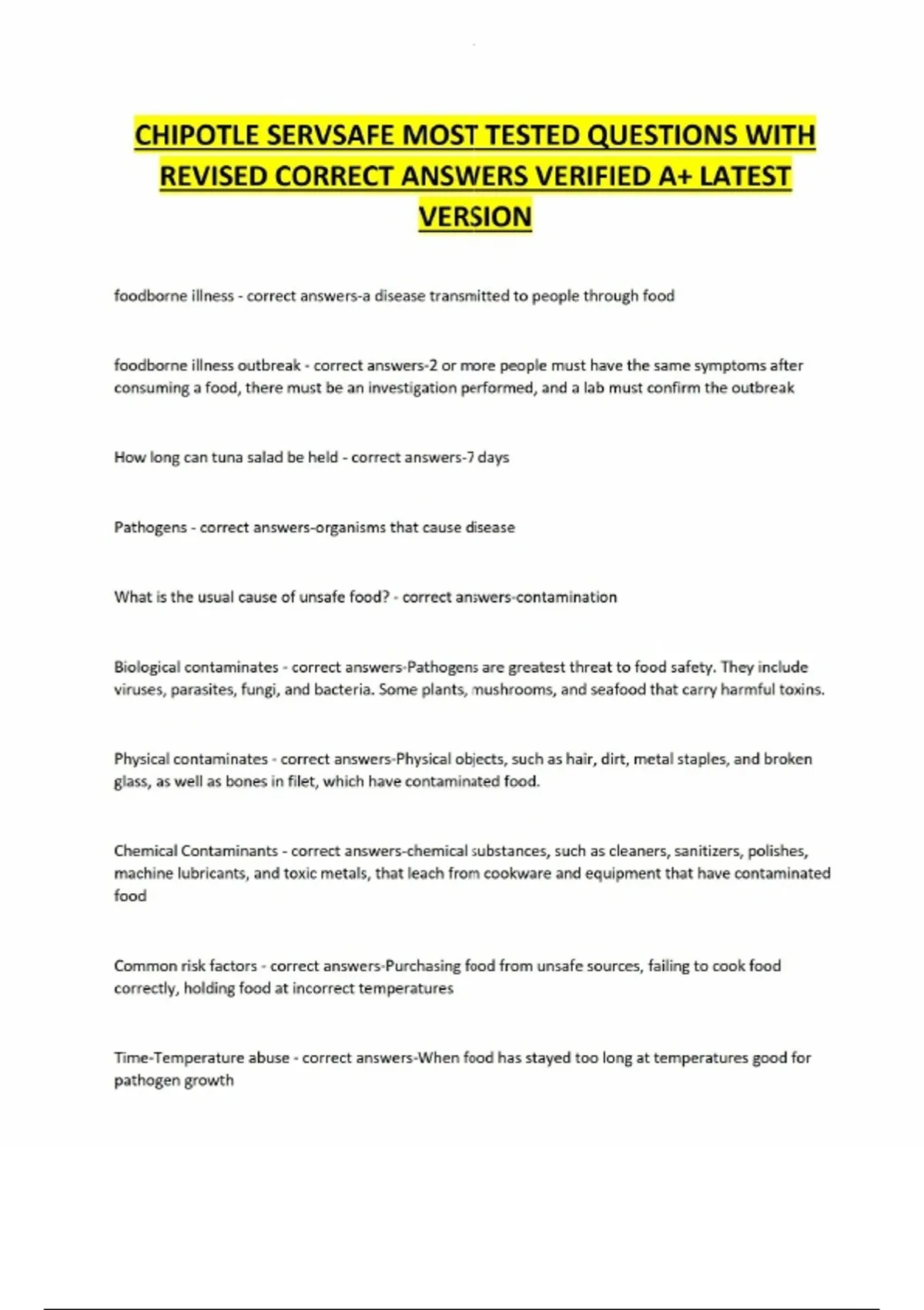 CHIPOTLE SERVSAFE MOST TESTED QUESTIONS WITH REVISED CORRECT ANSWERS VERIFIED A+ LATEST VERSION