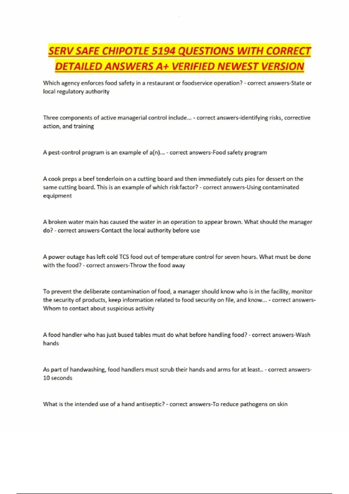 SERV SAFE CHIPOTLE 5194 QUESTIONS WITH CORRECT DETAILED ANSWERS A+ VERIFIED NEWEST VERSION Which agency enforces food safety in a restaurant or foodservice operation? - correct answers-State or local regulatory authority Three components of active managerial control include... - correct answers-identifying risks, corrective action, and training A pest-control program is an example of a(n)... - correct answers-Food safety program A cook preps a beef tenderloin on a cutting board and then immediately cuts pies for dessert on the same cutting board. This is an example of which risk factor? - correct answers-Using contaminated equipment A broken water main has caused the water in an operation to appear brown. What should the manager do? - correct answers-Contact the local authority before use A power outage has left cold TCS food out of temperature control for seven hours. What must be done with the food? - correct answers-Throw the food away To prevent the deliberate contamination of food, a manager should know who is in the facility, monitor the security of products, keep information related to food security on file, and know... - correct answers-Whom to contact about suspicious activity