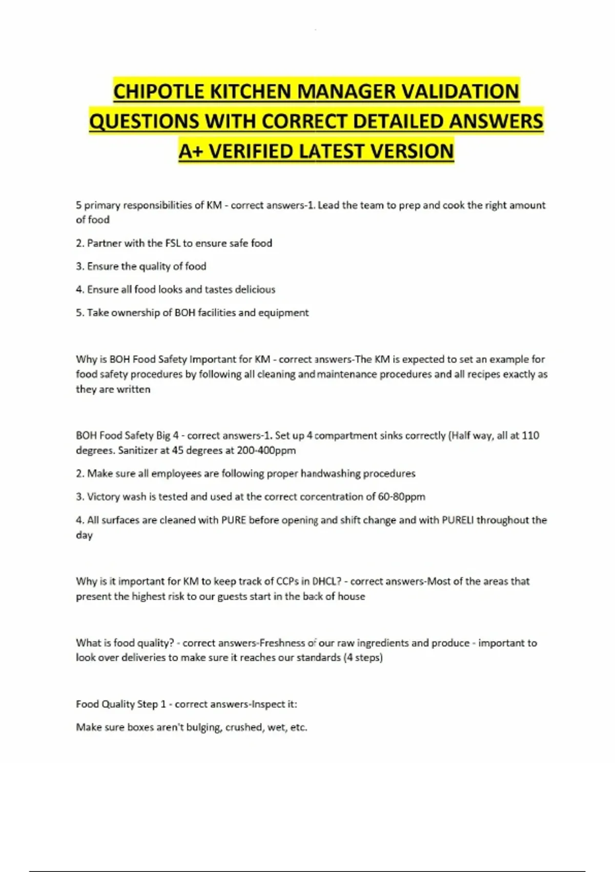 CHIPOTLE KITCHEN MANAGER VALIDATION QUESTIONS WITH CORRECT DETAILED ANSWERS A+ VERIFIED LATEST VERSION 5 primary responsibilities of KM - correct answers-1. Lead the team to prep and cook the right amount of food 2. Partner with the FSL to ensure safe food 3. Ensure the quality of food 4. Ensure all food looks and tastes delicious 5. Take ownership of BOH facilities and equipment Why is BOH Food Safety Important for KM - correct answers-The KM is expected to set an example for food safety procedures by following all cleaning and maintenance procedures and all recipes exactly as they are written BOH Food Safety Big 4 - correct answers-1. Set up 4 compartment sinks correctly (Half way, all at 110 degrees. Sanitizer at 45 degrees at 200-400ppm 2. Make sure all employees are following proper handwashing procedures 3. Victory wash is tested and used at the correct concentration of 60-80ppm 4. All surfaces are cleaned with PURE before opening and shift change and with PURELl throughout the day Why is it important for KM to keep track of CCPs in DHCL? - correct answers-Most of the areas that present the highest risk to our guests start in the back of house