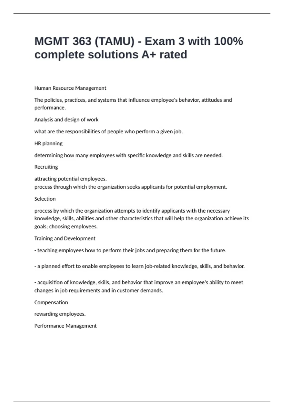 MGMT 363 (TAMU) - Exam 3 with 100% complete solutions A+ ratedHuman Resource Management The policies, practices, and systems that influence employee's behavior, attitudes and performance. Analysis and design of work what are the responsibilities of people who perform a given job. HR planning determining how many employees with specific knowledge and skills are needed. Recruiting attracting potential employees. process through which the organization seeks applicants for potential employment. Selection process by which the organization attempts to identify applicants with the necessary knowledge, skills, abilities and other characteristics that will help the organization achieve its goals; choosing employees. Training and Development - teaching employees how to perform their jobs and preparing them for the future. - a planned effort to enable employees to learn job-related knowledge, skills, and behavior. - acquisition of knowledge, skills, and behavior that improve an employee's ability to meet changes in job requirements and in customer demands. Compensation rewarding employees. Performance Management