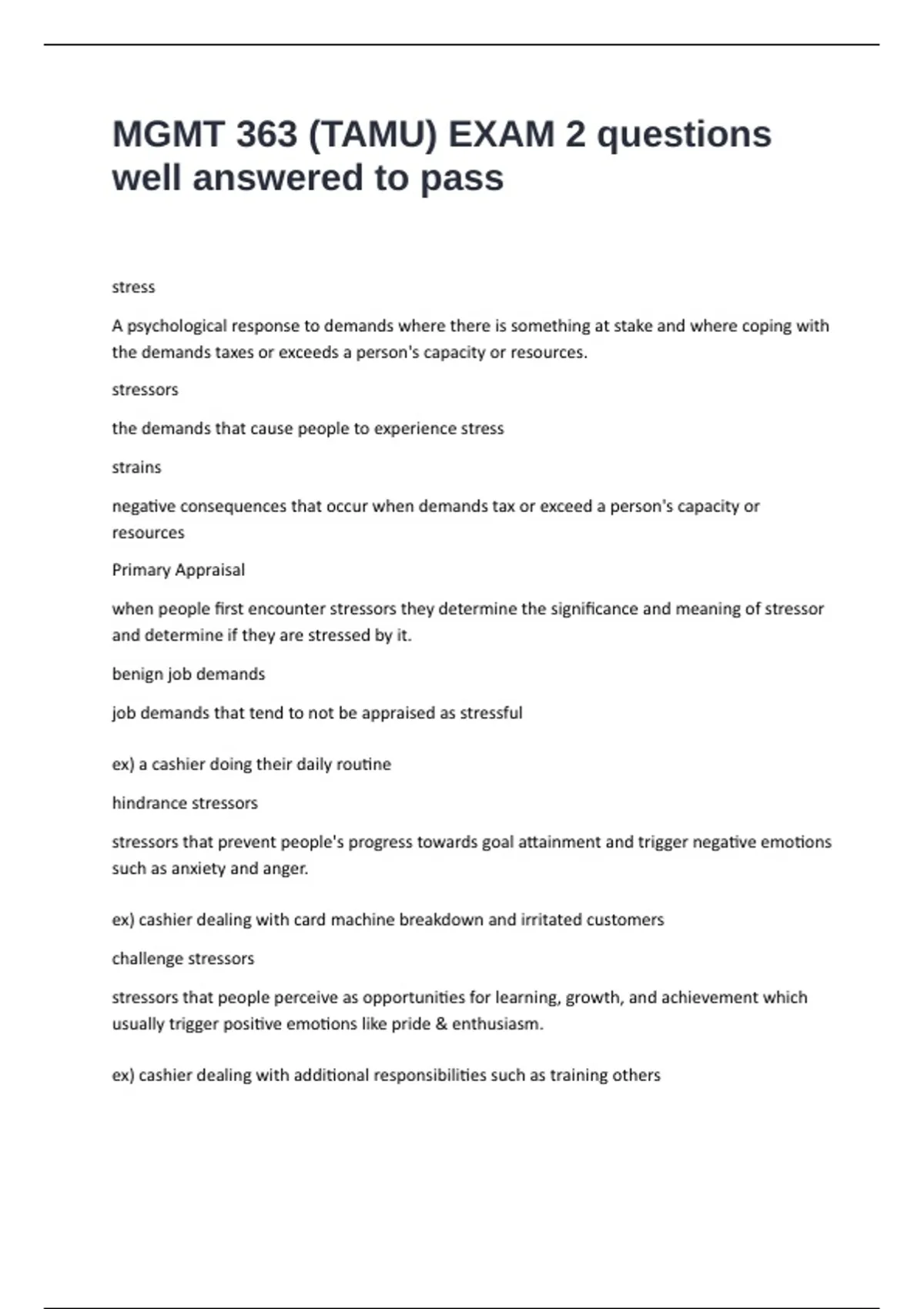 MGMT 363 (TAMU) EXAM 2 questions well answered to passstress A psychological response to demands where there is something at stake and where coping with the demands taxes or exceeds a person's capacity or resources. stressors the demands that cause people to experience stress strains negative consequences that occur when demands tax or exceed a person's capacity or resources Primary Appraisal when people first encounter stressors they determine the significance and meaning of stressor and determine if they are stressed by it. benign job demands job demands that tend to not be appraised as stressful ex) a cashier doing their daily routine hindrance stressors stressors that prevent people's progress towards goal attainment and trigger negative emotions such as anxiety and anger. ex) cashier dealing with card machine breakdown and irritated customers challenge stressors stressors that people perceive as opportunities for learning, growth, and achievement which usually trigger positive emotions like pride & enthusiasm. ex) cashier dealing with additional responsibilities such as training others