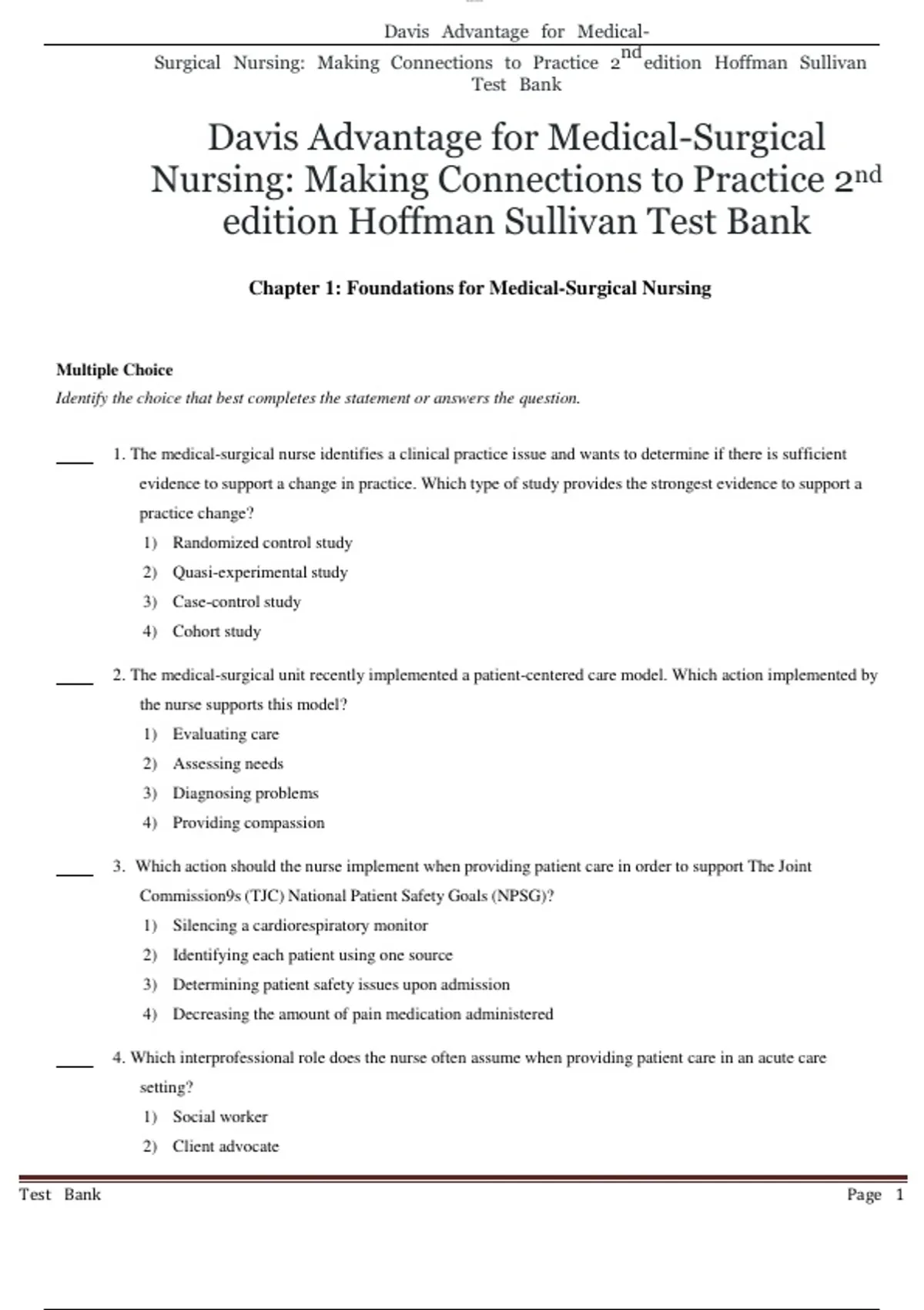 Davis Advantage for Medical-Surgical Nursing: Making Connections to Practice 2nd edition Hoffman Sullivan Test BankDavis Advantage for Medical-Surgical Nursing: Making Connections to Practice 2nd edition Hoffman Sullivan Test Bank