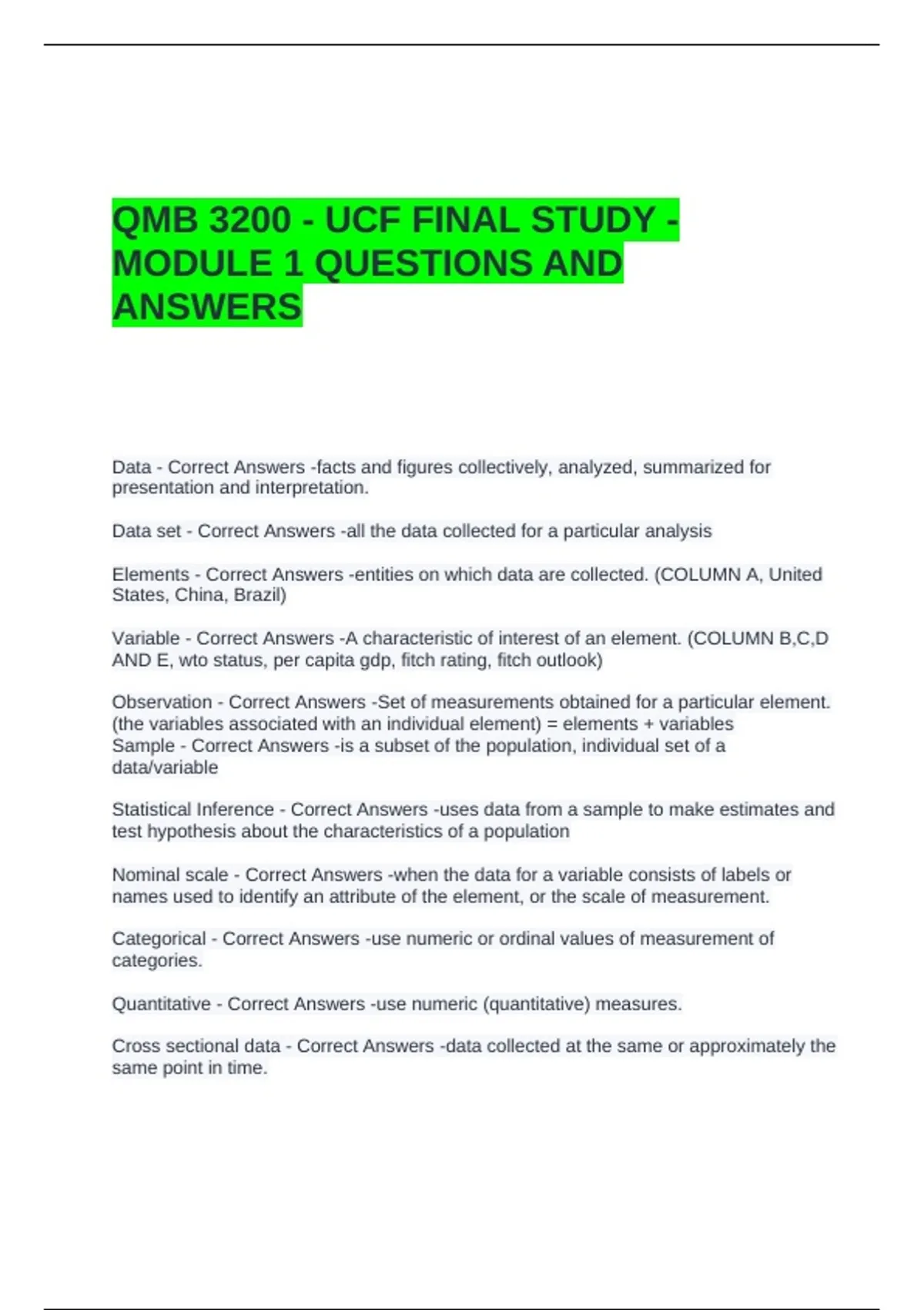 QMB 3200 - UCF FINAL STUDY - MODULE 1 QUESTIONS AND ANSWERS-