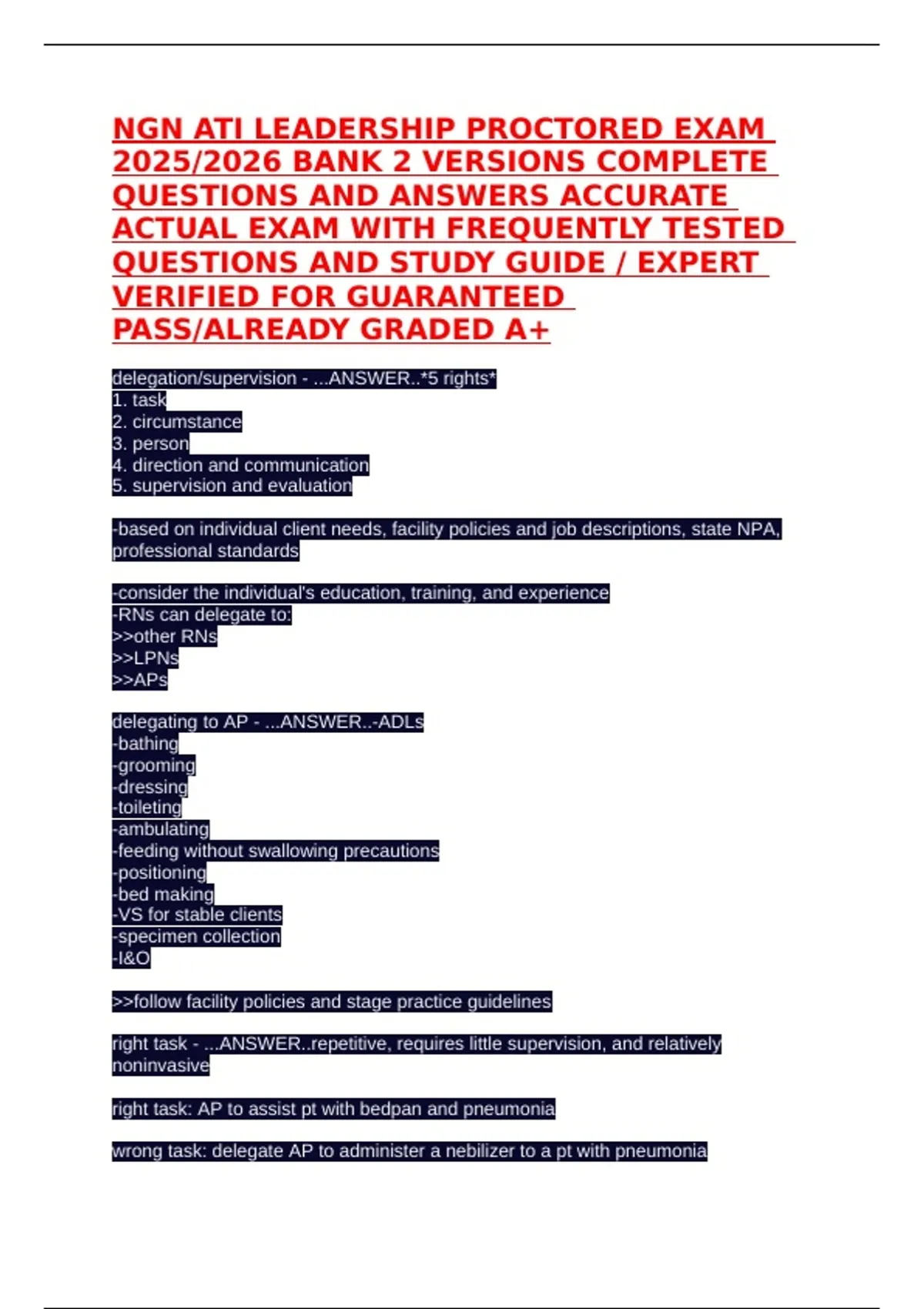 NGN ATI LEADERSHIP PROCTORED EXAM 2025/2026 BANK 2 VERSIONS COMPLETE QUESTIONS AND ANSWERS ACCURATE ACTUAL EXAM WITH FREQUENTLY TESTED QUESTIONS AND STUDY GUIDE / EXPERT VERIFIED FOR GUARANTEED PASS/ALREADY GRADED A+