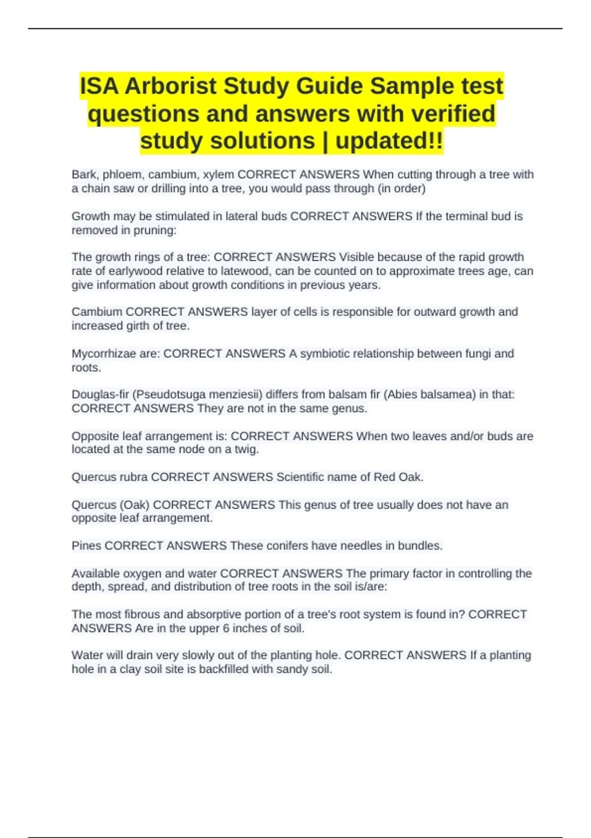ISA Arborist Study Guide Sample test questions and answers with verified study solutions | updated!!