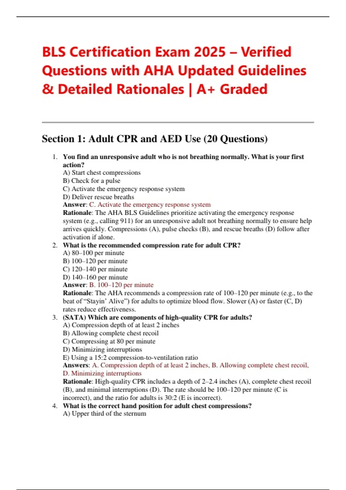 Section 1: Adult CPR and AED Use (20 Questions)