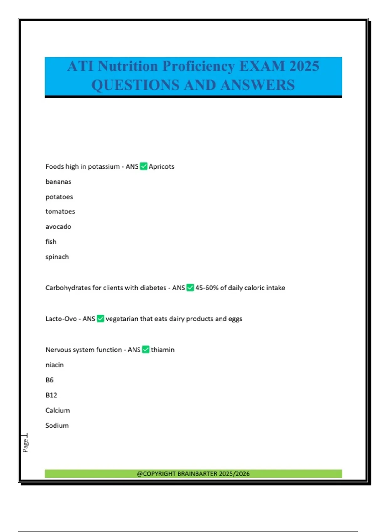 Foods high in potassium - ANS Apricots bananas potatoes tomatoes avocado fish spinach Carbohydrates for clients with diabetes - ANS 45-60% of daily caloric intake Lacto-Ovo - ANS vegetarian that eats dairy products and eggs Nervous system function - ANS thiamin niacin B6 B12 Calcium Sodium @COPYRIGHT BRAINBARTER 2025/2026 Page2 Normal BMI - ANS 18.5 - 24.9 Obesity BMI - ANS greater than 30 Kosher, Orthodox Judaism - ANS Meat No mixing meat and dairy (cheeseburger) No pork or shellfish Fish must have scales and fins Seventh-Day Adventist - ANS Strict vegetarian diet, some are lacto-ovo, some are vegan Avoid: alcohol, coffee, tea, caffeine 3 Complications of TPN - ANS Diarrhea Polyuria Hypocalcemia Which has more calcium - yogurt or cheese? - ANS Yogurt Niacin found in: - ANS Beef liver Nuts Legumes Whole-grain enrich