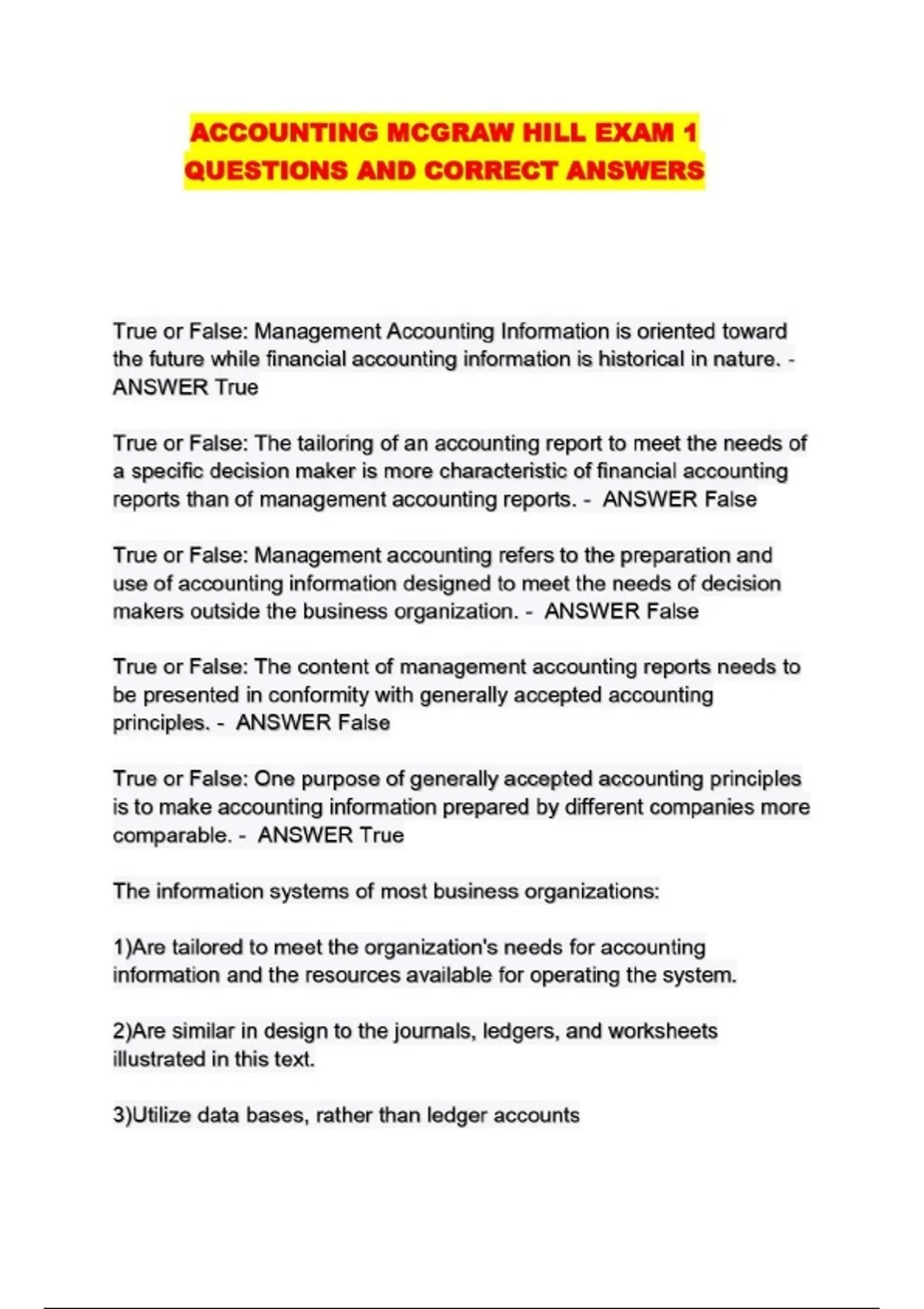 ACCOUNTING MCGRAW HILL EXAM 1 QUESTIONS AND CORRECT ANSWERS....
