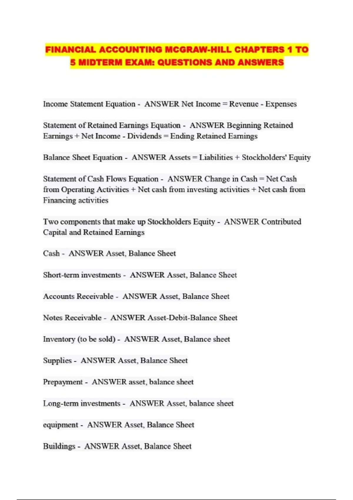 FINANCIAL ACCOUNTING MCGRAW-HILL CHAPTERS 1 TO 5 MIDTERM EXAM; QUESTIONS AND ANSWERS...