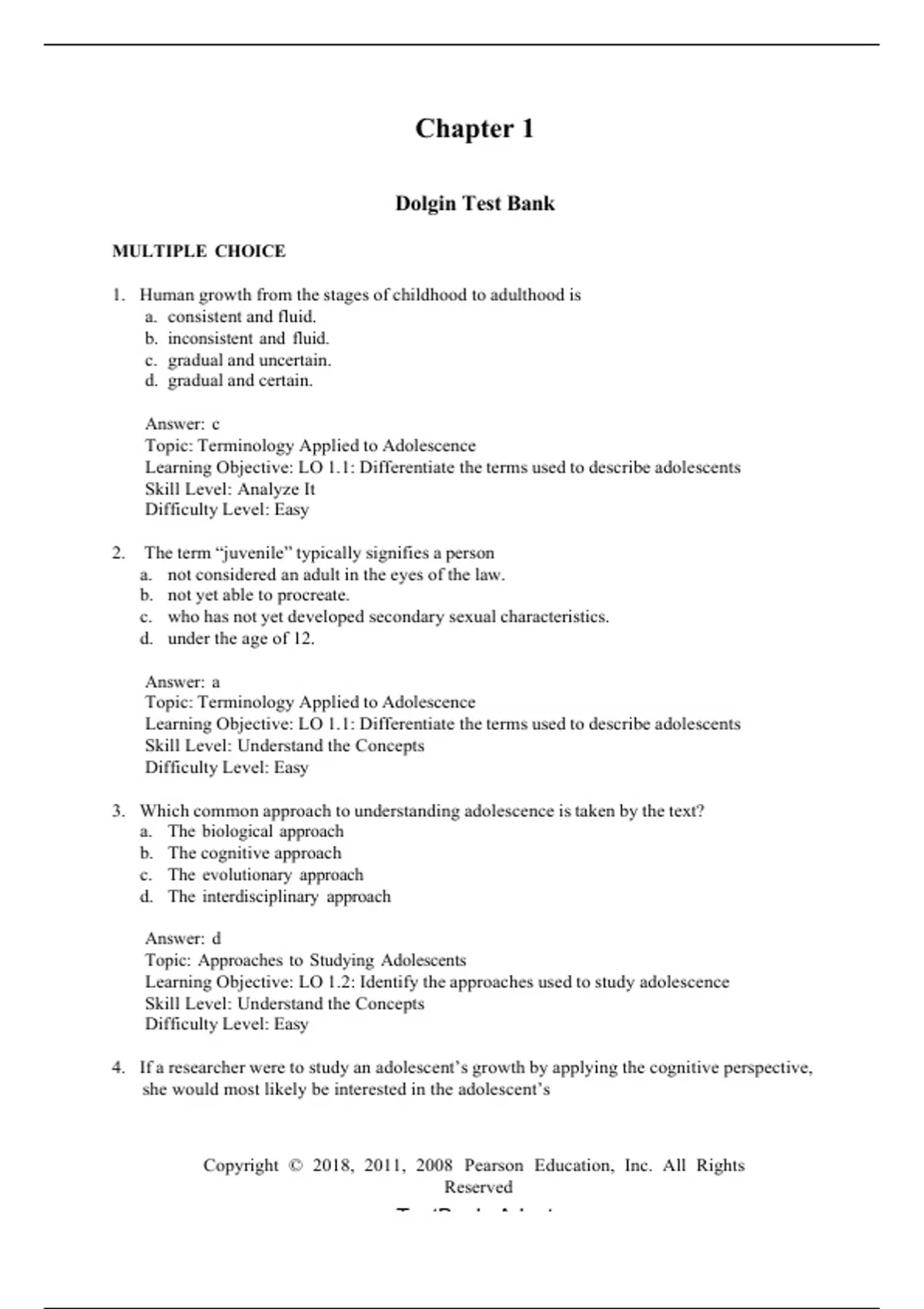 Test Bank for The Adolescent: Development, Relationships, and Culture 14th Edition(Dolgin, 2017), Chapter 1-16 | All Chapters