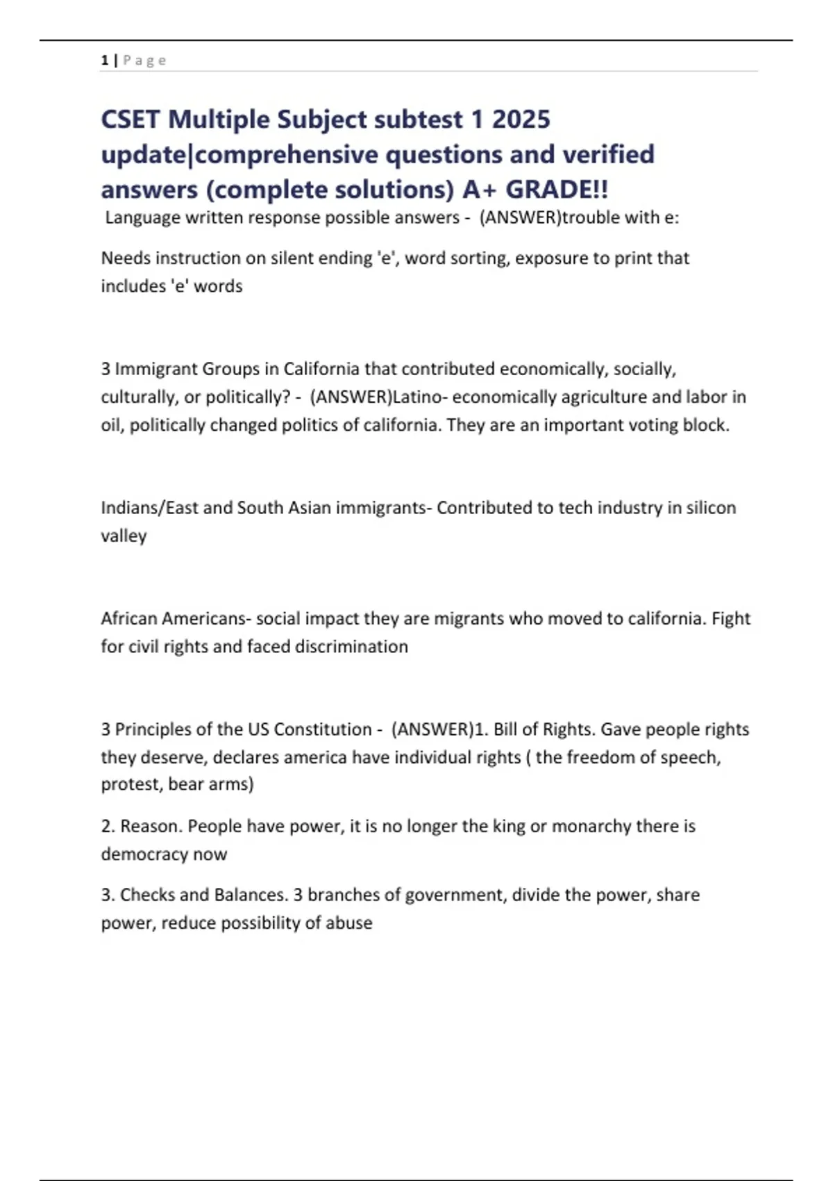 CSET Multiple Subject subtest 1 2025 update|comprehensive questions and verified answers (complete solutions) A+ GRADE!!