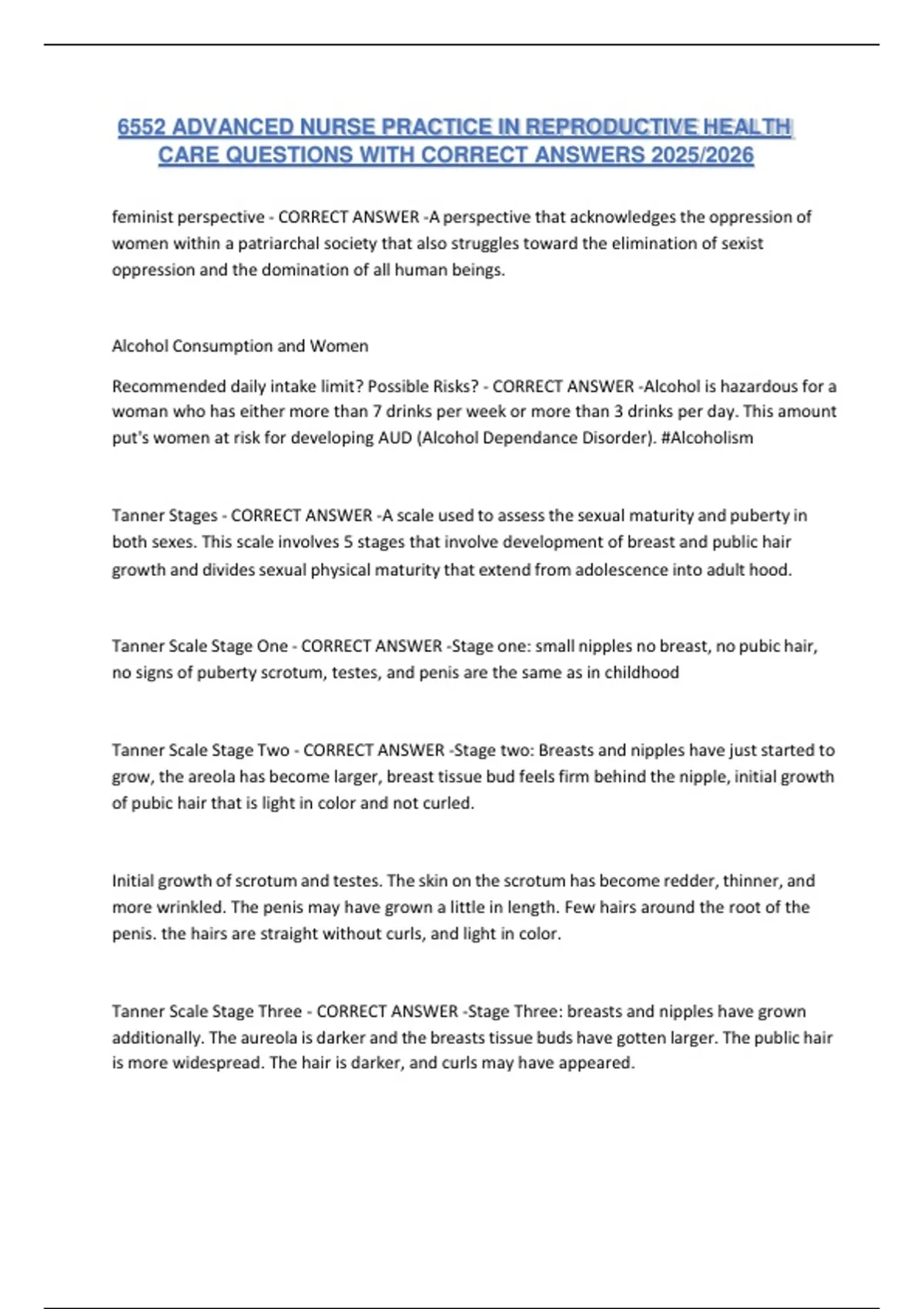 This document provides 6552 Advanced Nurse Practice in Reproductive Health Care Exam Questions with 100% Correct Answers, fully updated for 2025/2026. It is designed to help nursing students and practitioners master reproductive health care concepts and pass their exams with confidence. What’s included: 6552 comprehensive questions with correct answers Updated for 2025/2026 based on the latest nursing curriculum Covers reproductive health, maternal and child care, advanced nursing interventions, ethics, and clinical practice Verified and accurate solutions for reliable exam prep Perfect for exam review, practice tests, or quick revision This trusted study resource ensures you are well-prepared, confident, and exam-ready, making it easier to achieve top results.